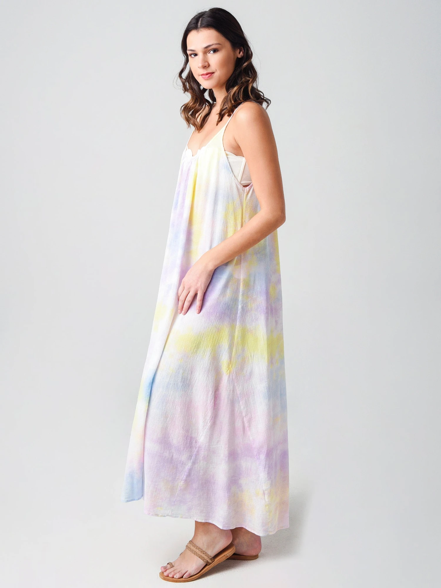 FEATURES:Cover-Up DressScoop NecklineThin, Adjustable Spaghetti StrapsAnkle Length MaxiAll-Over Cloud Tie-DyeTrapeze StyleLightweightMade in USA100% CottonModel is wearing size Small cover-up.Model’s Measurements: Height: 5’9.5″; Bust: 34A; Waist: 26.5″; Hips: 37″; Dress Size: 2-4 (US)