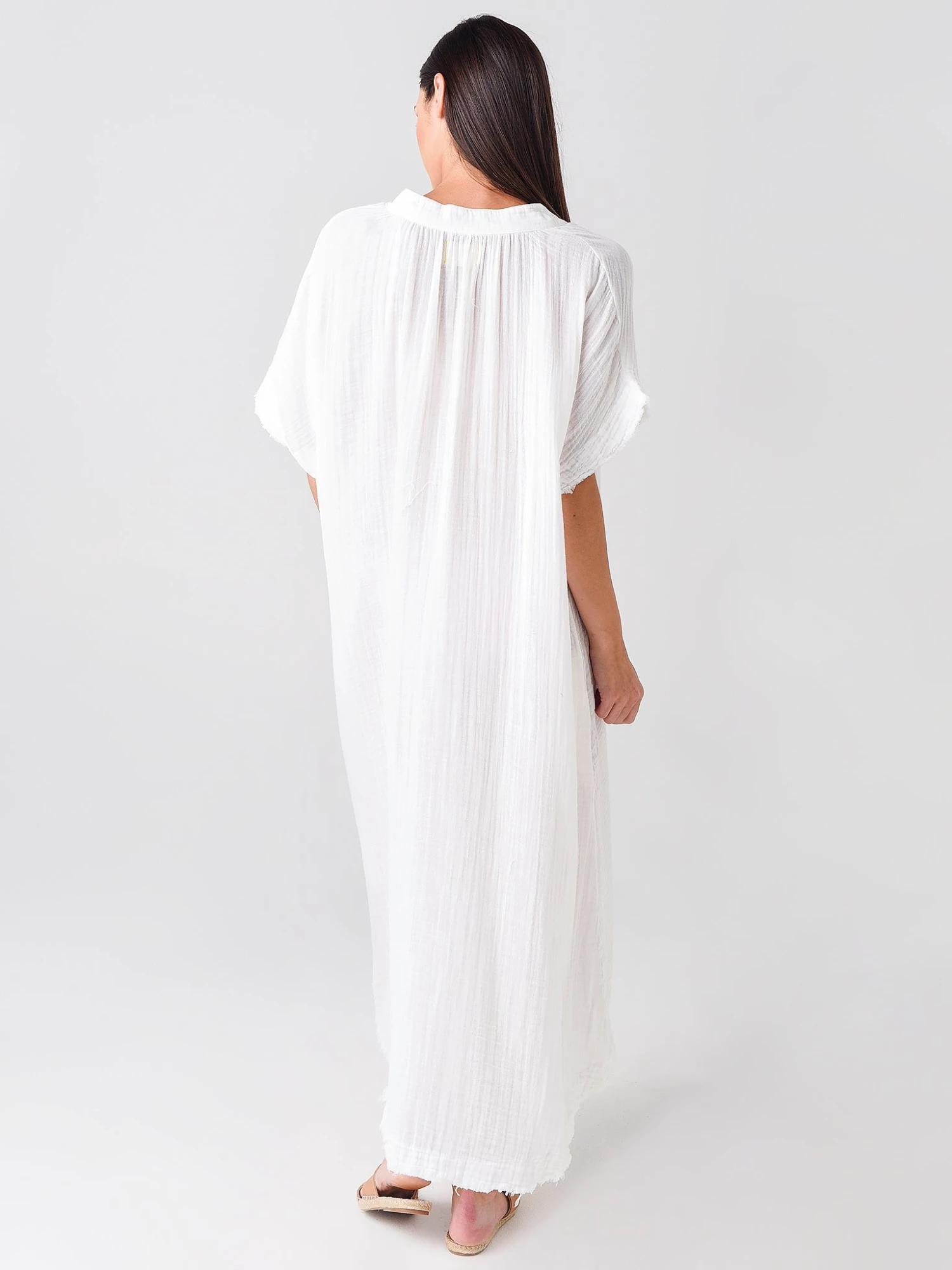 FEATURES:Caftan, Cover-UpSplit, V-NecklineShort sleeveOn-Seam PocketsRaw EdgesCrinkle Gauze FabricationSemi-SheerLightweightRelaxed Fit100% CottonModel is wearing size One-Size (O/S) caftan.Model’s Measurements: Height: 5’9.5″; Bust: 34A; Waist: 26.5″; Hips: 37″; Dress Size: 2-4 (US)