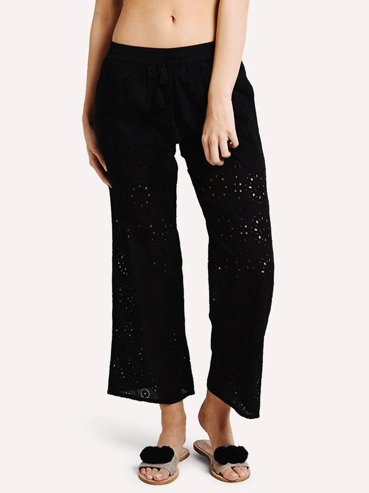 FEATURES:Wide Leg PantEyelet Lace DetailsPull-On WearabilityPom-Pom Tassel Draswstring at WaistSubtle Sheer Detailing100% CottonStyled with La Blanca crop Style # LB9YA75 and La Blanca bikini bottom Style # LB6BA96 AND Binge sandals style # KAIPS.