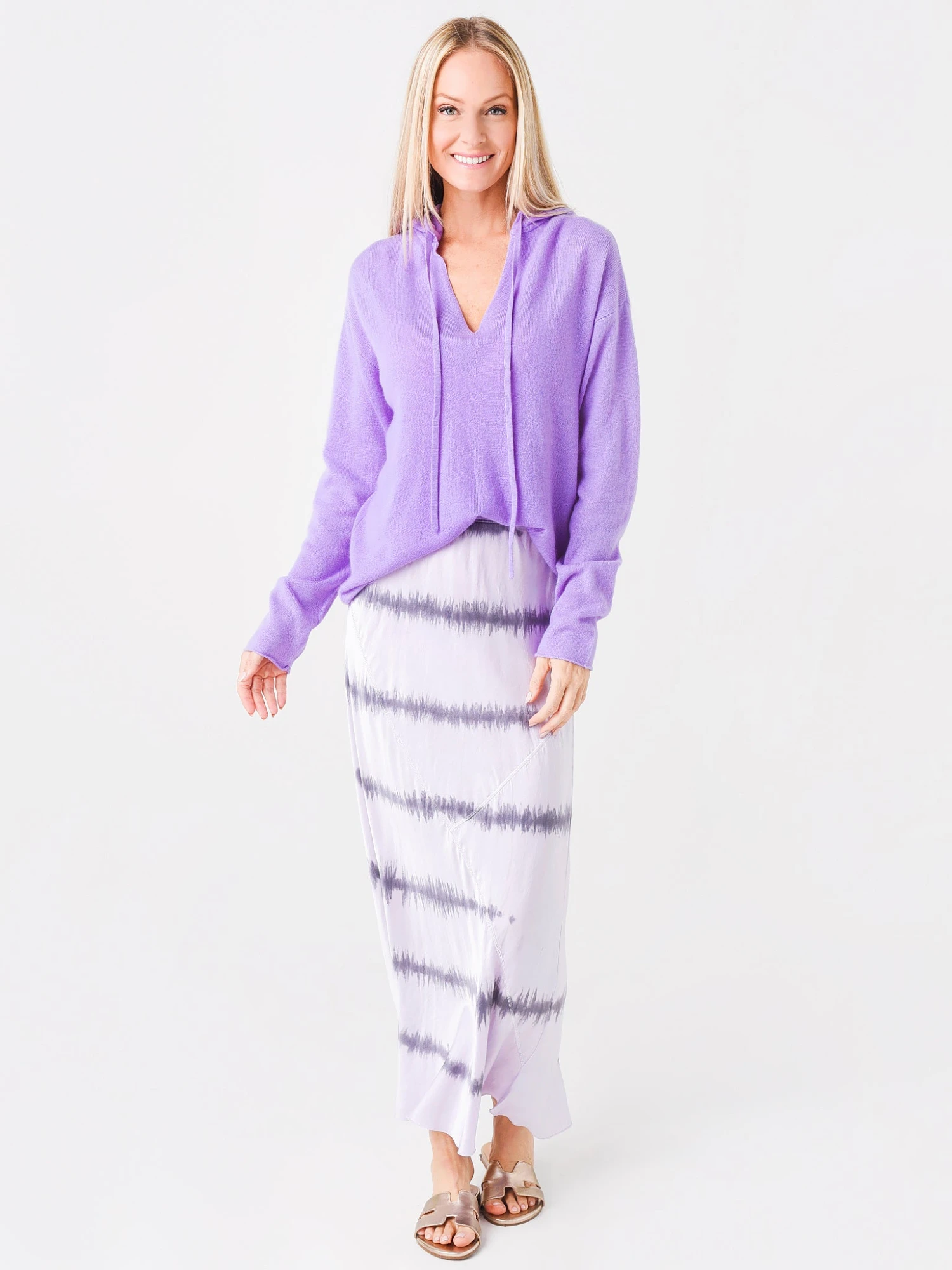 FEATURES:Pullover HoodieV-NecklineSelf TiesRaw Cuffs and HemUltra Soft Lightweight Cashmere Fabrication100% CashmereRelaxed Fit