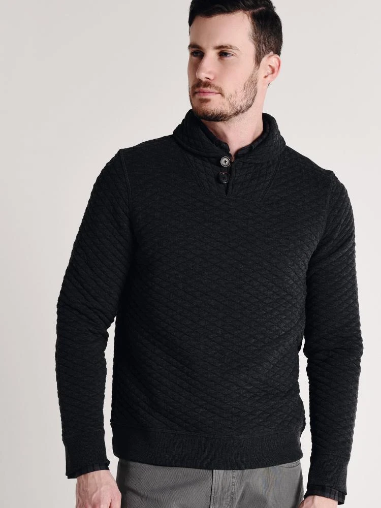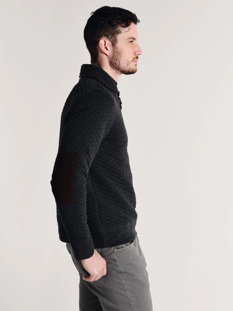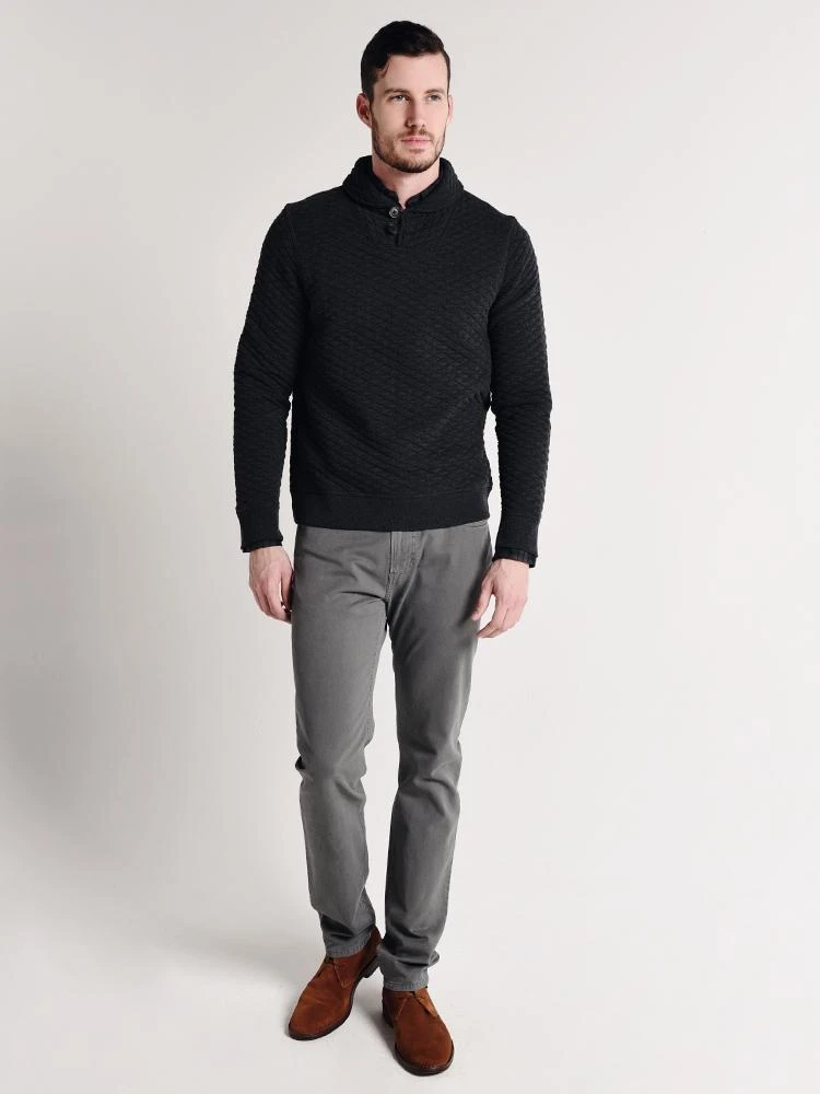 FEATURES:Shawl collarTwo leather loop button closure at frontHorn buttonsTwill tape detailingSuede elbow patches55% cotton, 45% polyester Machine wash cold Styled with Billy Reid shirt Style # 102-408, Bonobos pant Style # 14870 and Rodd and Gunn shoe Style # ZX0315. Model is wearing size medium sweater, size medium shirt and size 32 pant.