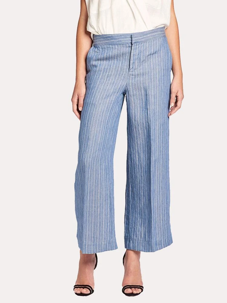FEATURES:Chambray PantCropped CutWide Leg DesignSubtle Stripe PrintFlat FrontElasticated WaistHook and Button with Zip-Fly ClosureSide Seam Pockets, Single Back Welt Pocket100% Linen