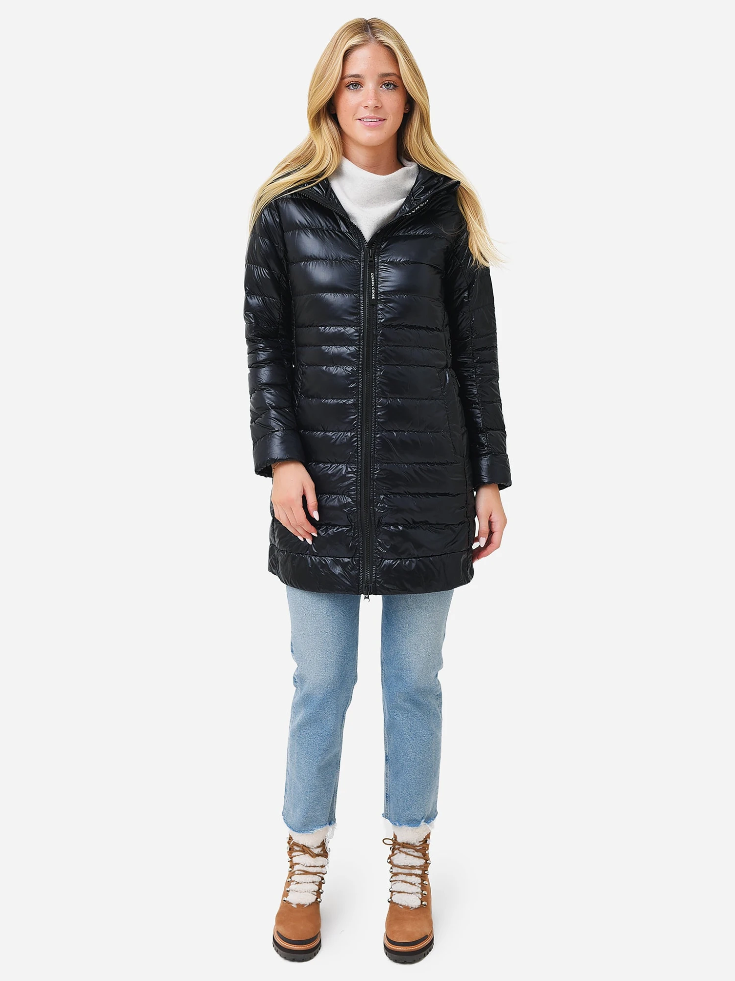 FEATURES:Down JacketAttached Adjustable Down-Filled HoodSueded Tricot ChinguardDouble-Stripe Reflective Detail on BackStorm Flap Underneath 2-Way ZipperAdjustable Belt Closure with Webbing and Snap ClosureSide Vents with Snap ClosuresRecessed Power Stretch Cuffs2 Exterior Hand Pockets with Zipper2 Interior PocketsKnee LengthWind-Resistant, Water-Repellant, Downproof, Ultra Lightweight, RipstopFill: 750 Fill Power White Duck DownModel is wearing size Small down jacket.Model’s Measurements: Height: 5’10” | Bust: 32B | Waist: 25″ | Hips: 37″ | Dress Size: 2 (US)