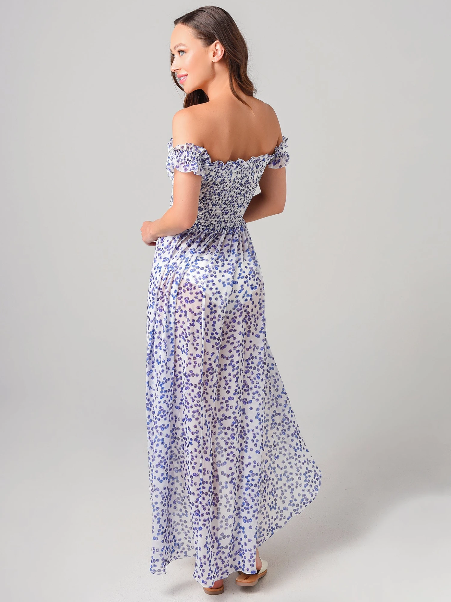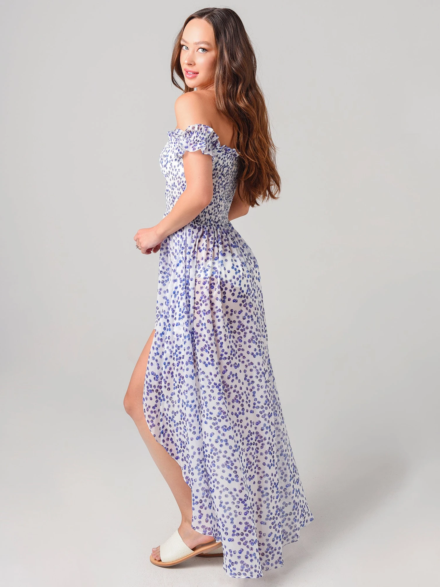 FEATURES:Cover-Up DressElasticized NecklineWear On or Off-The-ShoulderSmocked BodiceAll-Over Blue Toile PrintSemi SheerHigh-Low HemChiffon FabricationLightweightBody: 100% PolyesterModel is wearing size Small cover-up.Model’s Measurements: Height: 5’10.5″; Bust: 32C; Waist: 25″; Hips: 36″; Dress Size: 4 (US)