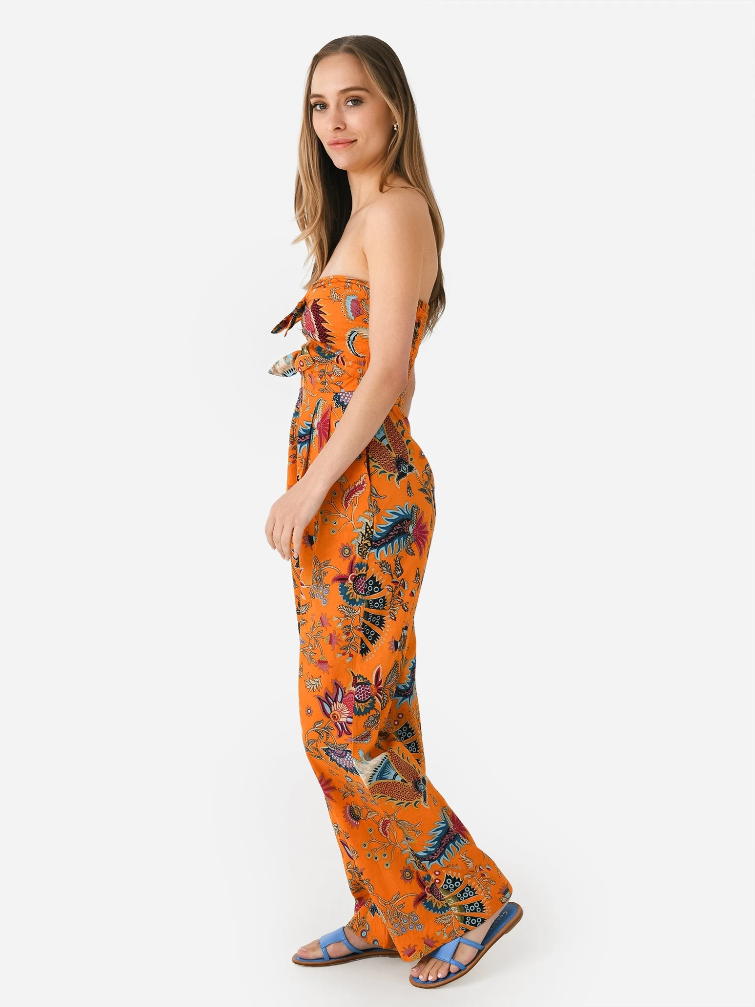 Bandeau-style jumpsuit made from lightweight cotton with a colorful novelty print.