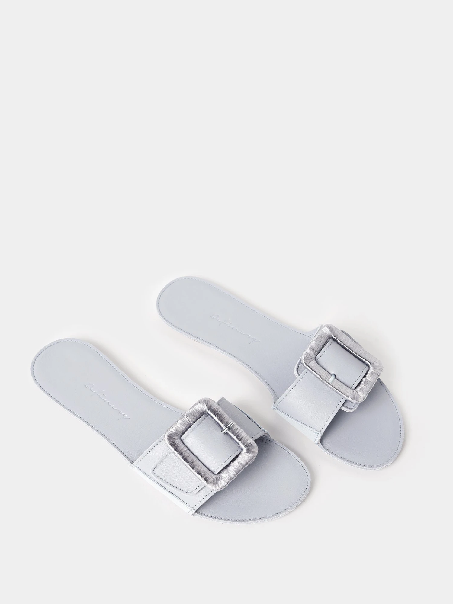 FEATURES:SandalOpen Toe, Rounded ToeSingle Wide Strap with Made-To-Measure BuckleUpper: Smooth CalfskinBuckle: Raffia Straw WrappedLining: Soft Grained CalfskinInsole: Soft Grained CalfskinOutsole: LeatherHeel: 5 mm Stacked