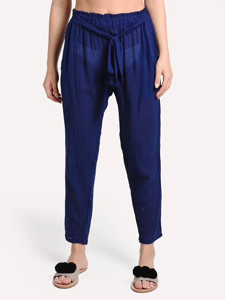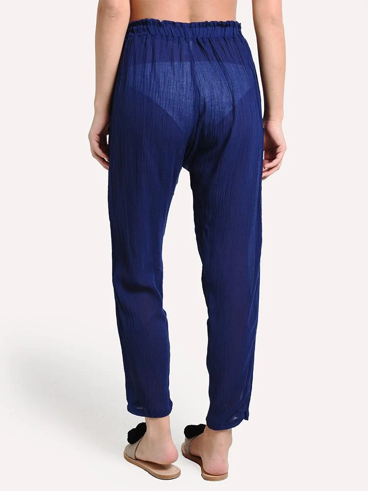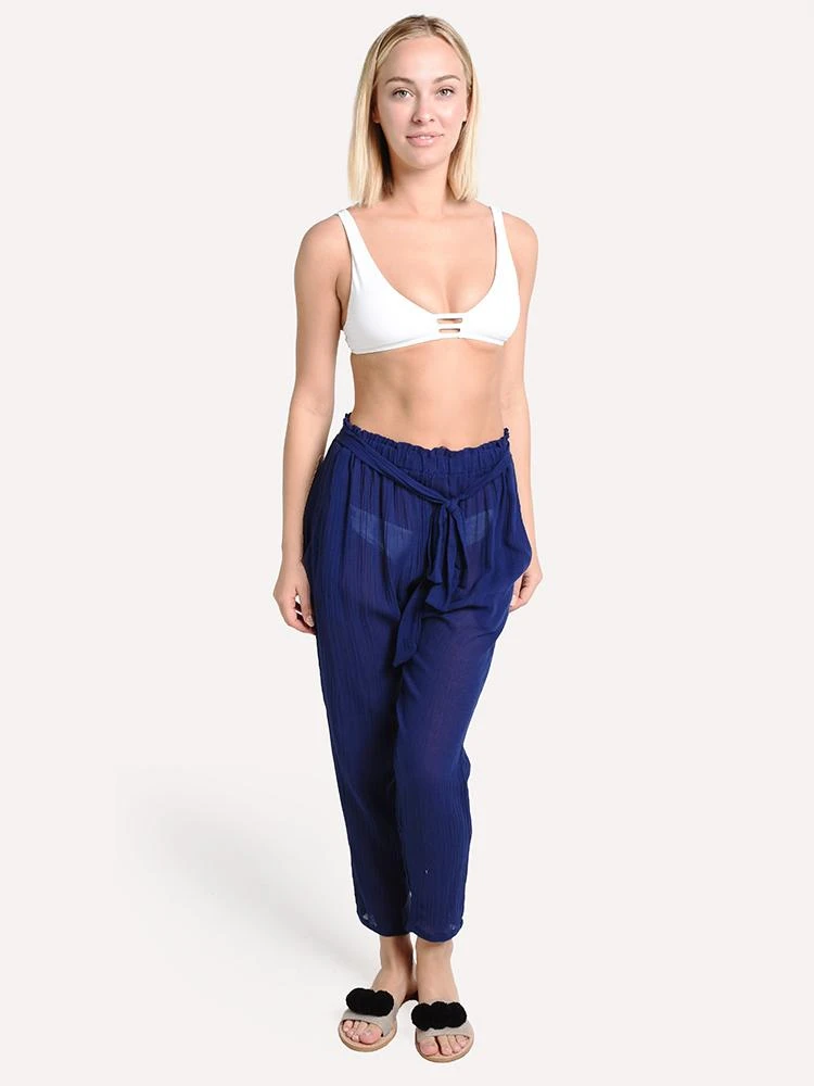 FEATURES:Sheer cover-up pants.Elastic waist with adjustable ties.Side hand pockets.Straight leg.70% bamboo from viscose, 30% cotton.Hand washModel is wearing size small pant.