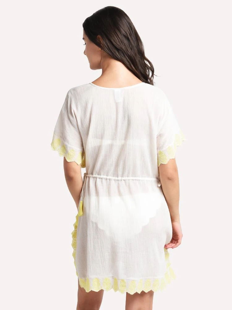 FEATURES:Cover-up dress features embroidered medallion trim.V-neckline.Draped short sleeves.Drawstring tie at waist with tasseled detailing.