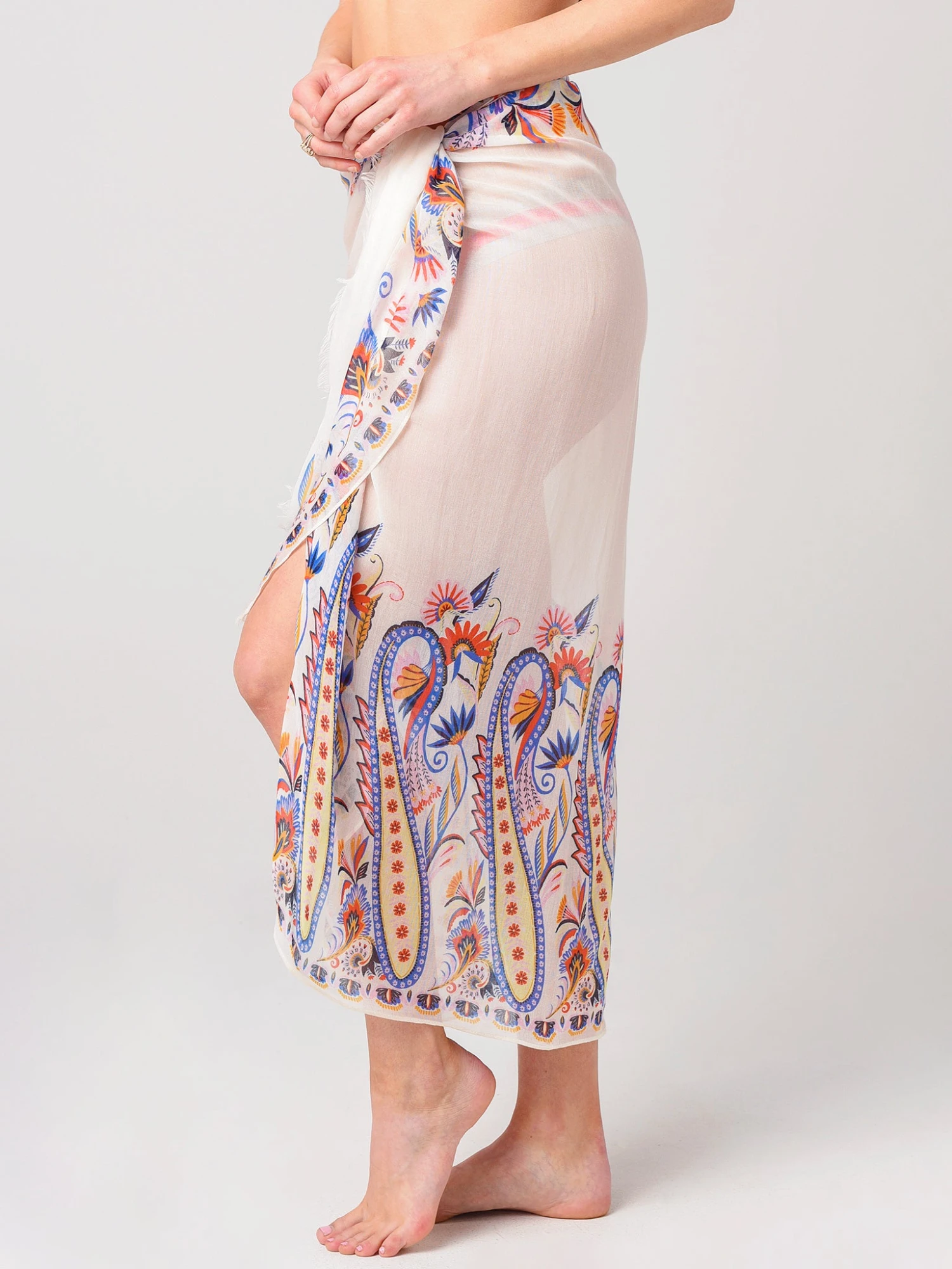 FEATURES:Cover-Up/Pareo/WrapPaisley Print along HemRaw EdgesSelf-Tie ClosureLightweightMulti-Functional, Versatile Wearability50% Cotton, 50% ViscoseModel is wearing size One-Size wrap.Model’s Measurements: Height: 5’10.5″; Bust: 32C; Waist: 25″; Hips: 36″; Dress Size: 4 (US)