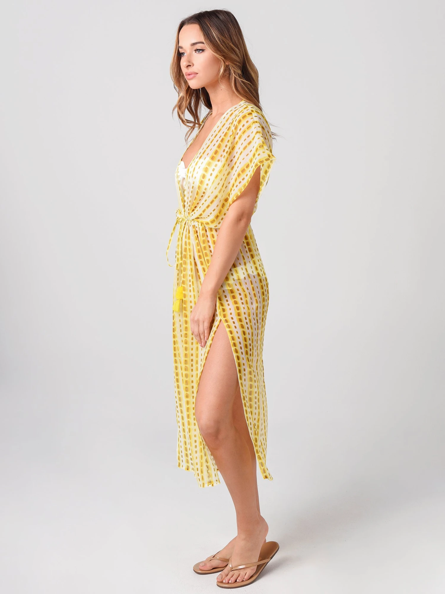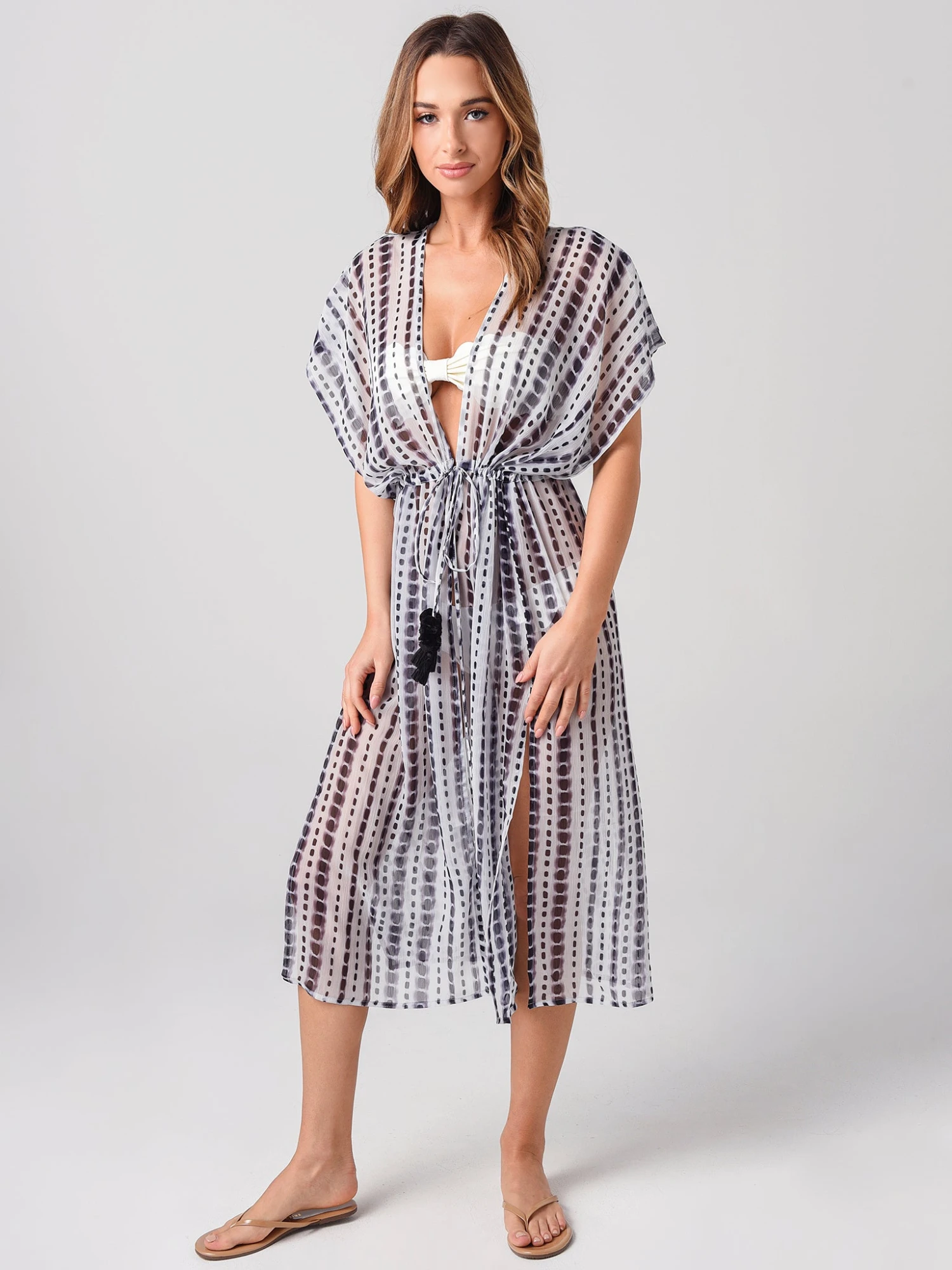 FEATURES:Cover-Up/CaftanMidi-LengthOpen Front, Waist Cincher TiesTassel DetailAll-Over Shibori PrintLightweight100% PolyesterModel is wearing size Small cover-up.Model’s Measurements: Height: 5’9″; Bust: 32C; Waist: 24.5″; Hips: 36″; Dress Size: 2 (US)