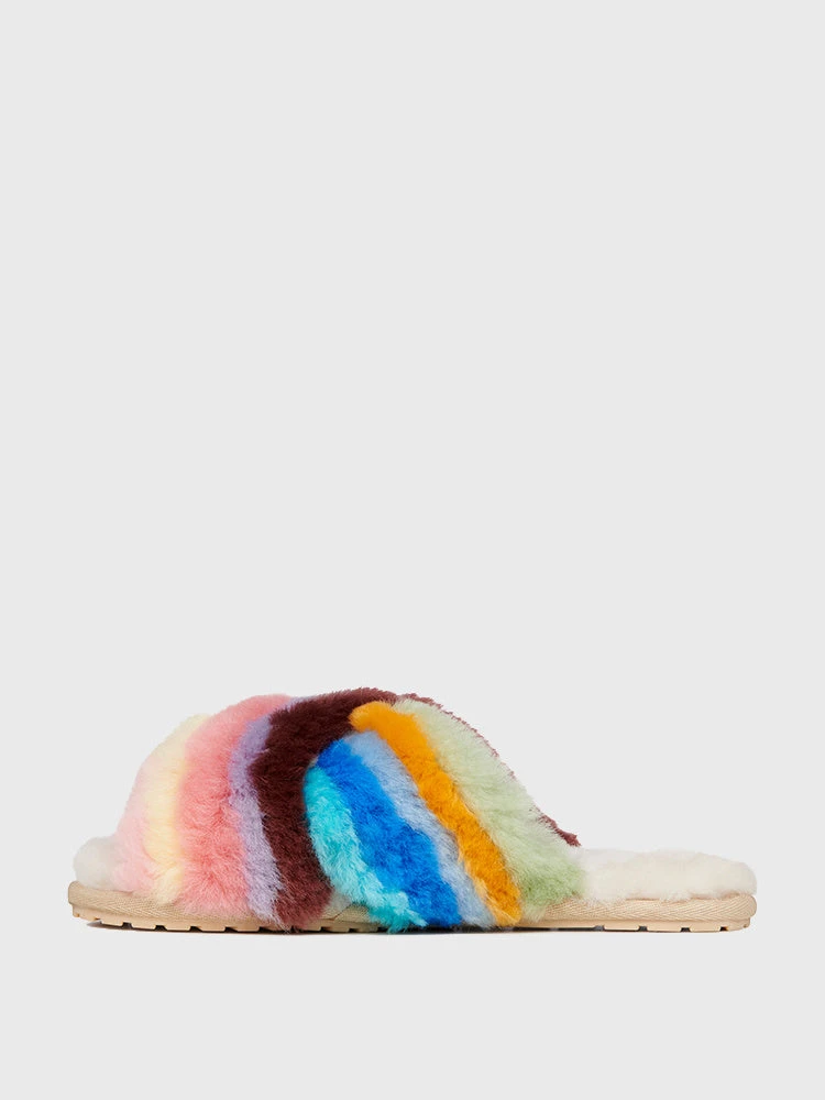 FEATURES:Slippers, SlidesCrossover Strap DesignSlide WearabilityUppers: 100% Australian SheepskinLining: 100% Australian SheepskinFootbed: 100% Australian SheepskinOutsole: Durable and Flexible TPRMulticolor, Rainbow DesignFluffy and Ultra-CozyBreathableWoolmark Accredited