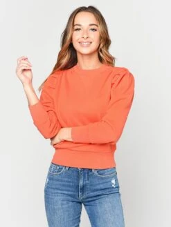 FEATURES:Pullover SweatshirtCrew NecklinePuff-SleeveRibbed Neck, Cuffs and HemShirred DetailsClassic Fit85% Cotton, 15% PolyesterModel is wearing size Small sweater.Model’s Measurements: Height: 5’9″; Bust: 32C; Waist: 24.5″; Hips: 36″; Dress Size: 2 (US)