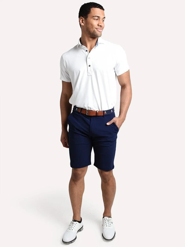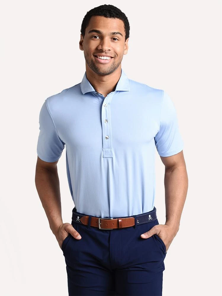 FEATURES:Golf Polo ShirtBlended Poly/Spandex MaterialPop Interior CollarSpread Collar4-Button PlacketVent TapeAntimicrobialQuick Drying and Moisture Wicking4-Way Stretch UV AB Sun Protection90% Polyester, 10% SpandexStyled with Greyson short style # SMS1001. Model is wearing size Medium polo and size 34 short.