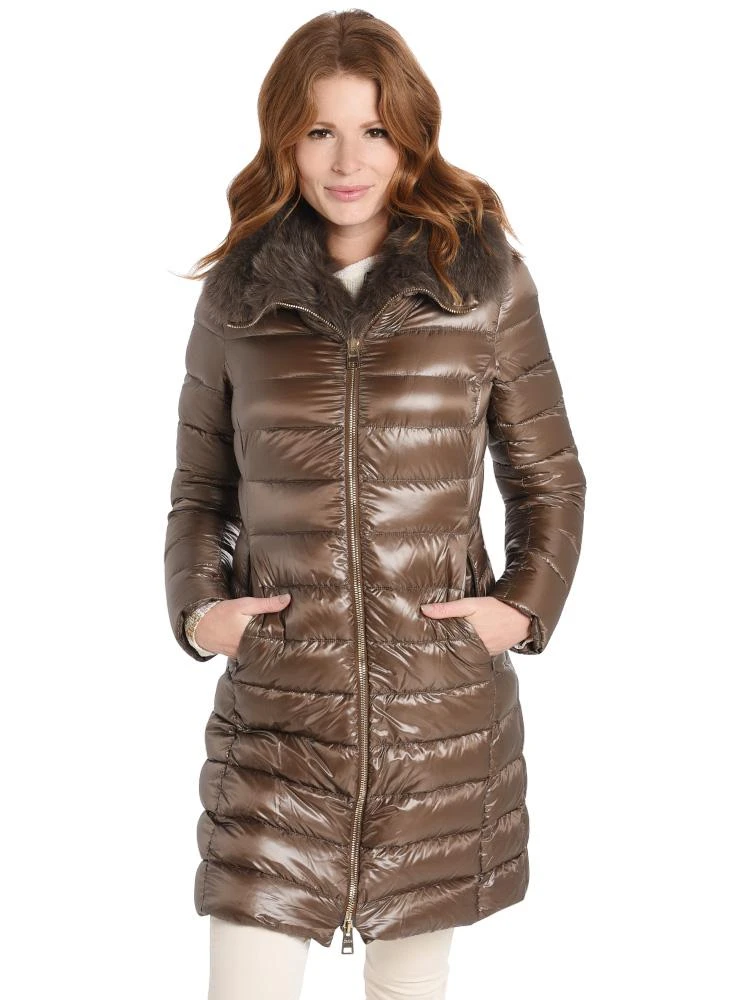 The Herno Long Fitted Nylon Coat With Big Fox Collar is a chic look with fur trim.