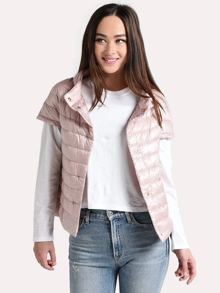 FEATURES:Front snap placket Short sleeve Front slit pockets Satin fabric finish Water-resistant treated fabric Goose down insulationImported
