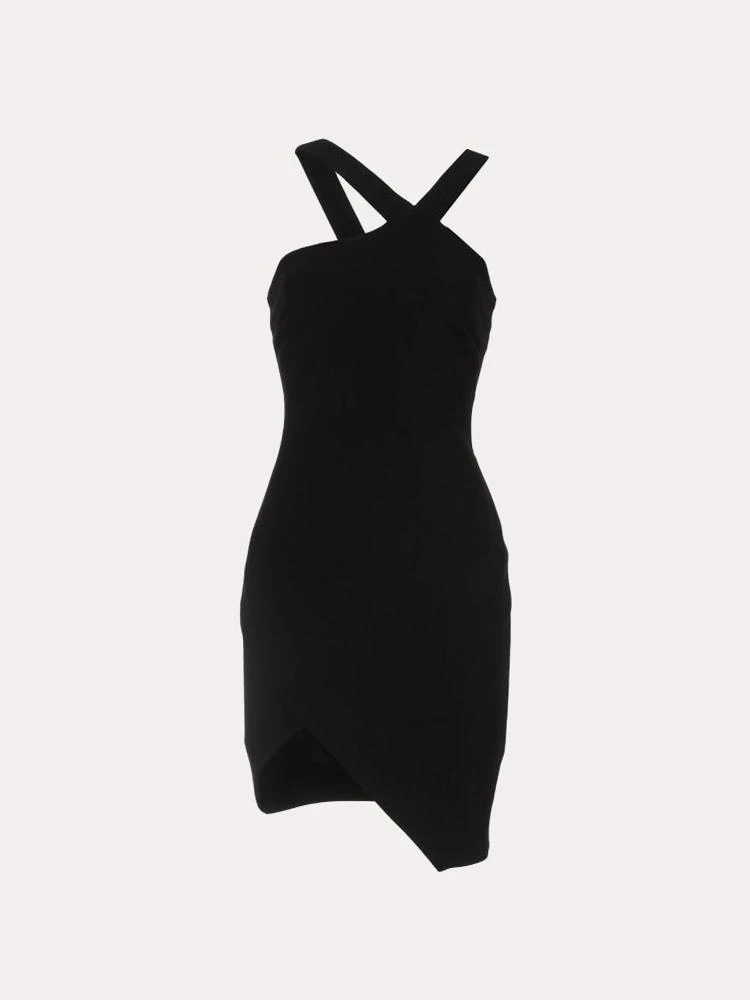 FEATURES:Asymmetrical crossover neckline Form fitting Asymmetrical hemline Hidden back zipper Lined 73% polyester/22% rayon/5% spandexDry clean