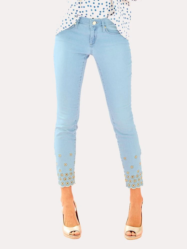 Because our goal is to make everything in life more fun. We’ve taken a regular skinny jean and made it more exciting with a scallop hem and gold detailing on the legs.