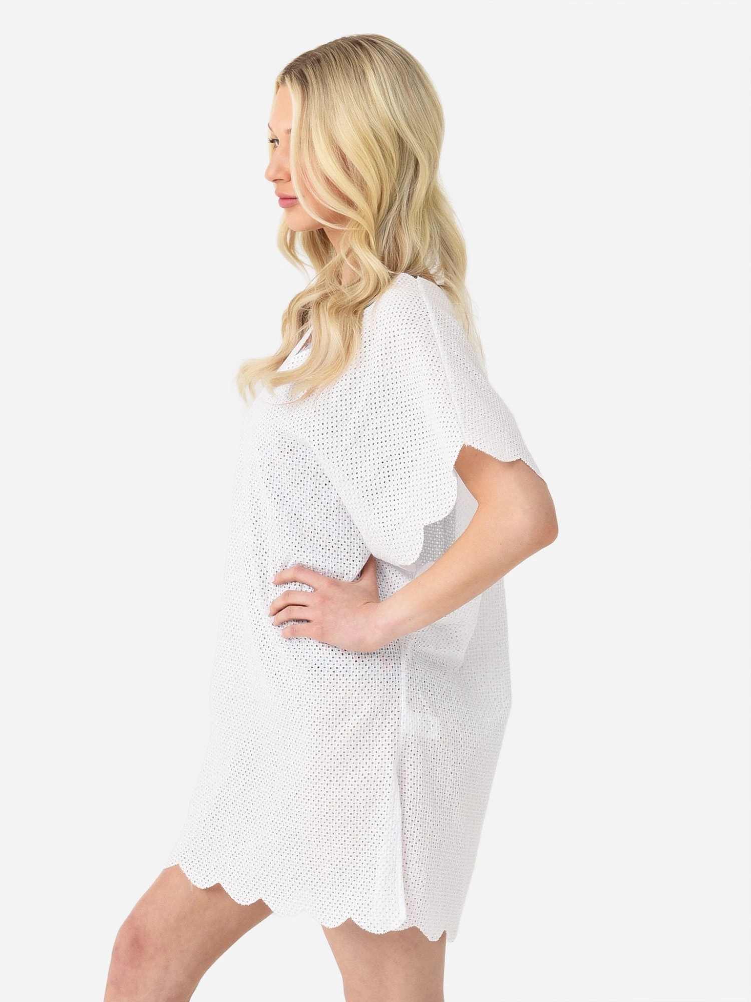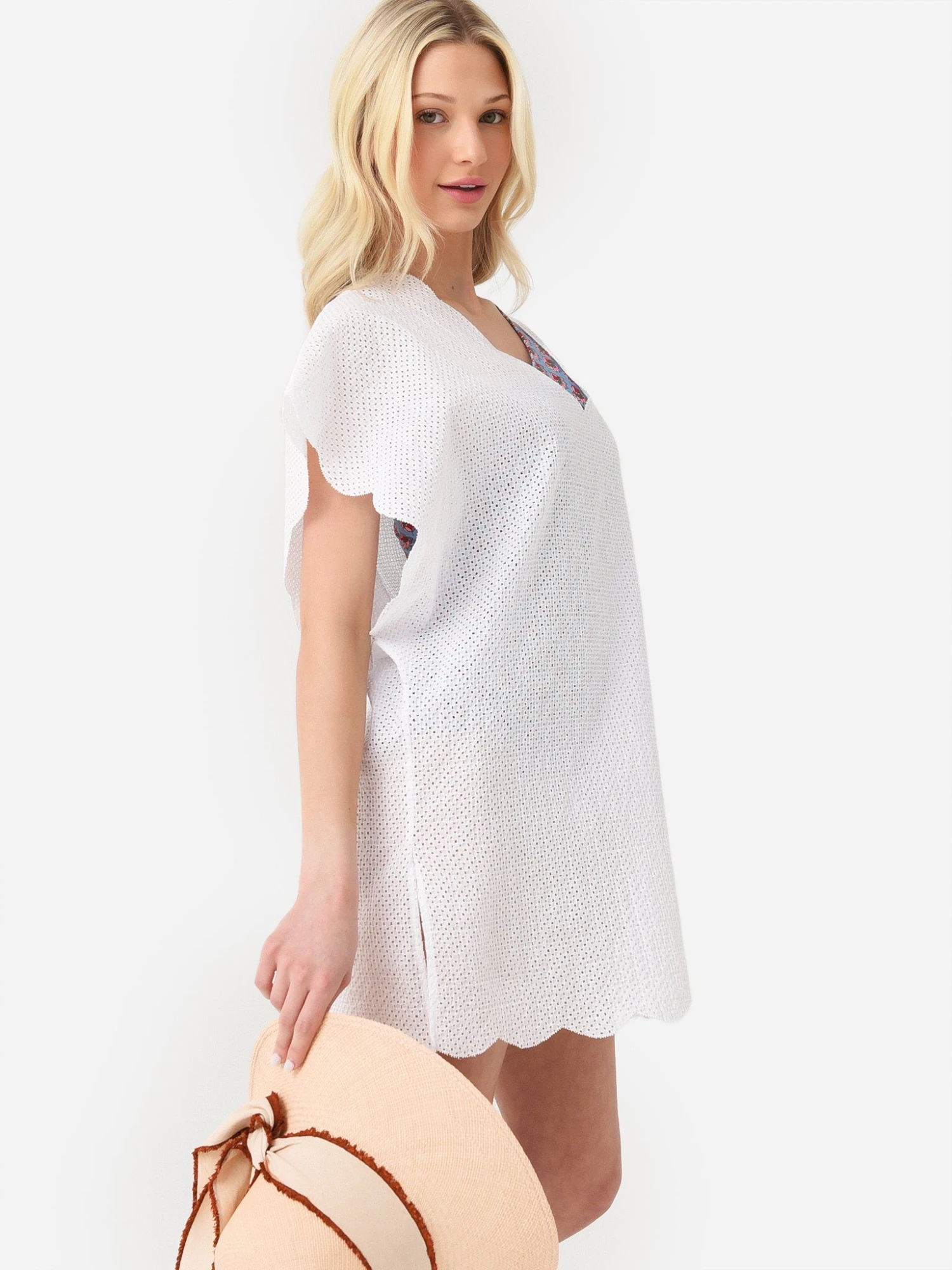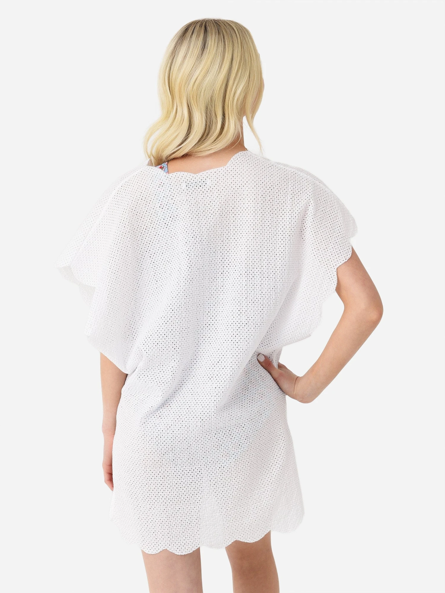 Tunic-length cover-up with scalloped edges and a semi-sheer eyelet fabrication.