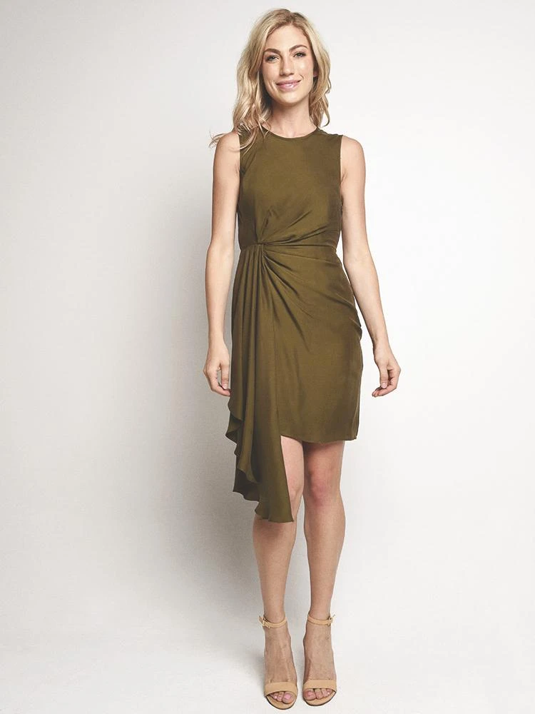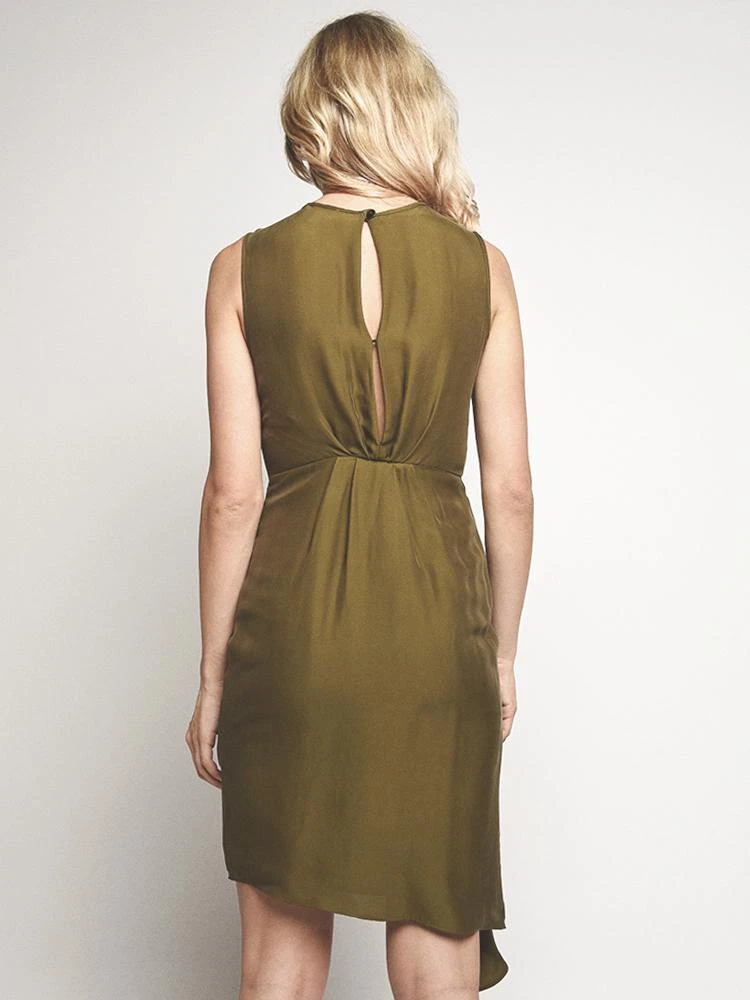 FEATURES:36 to shortest point; 45 to longest point (size 8)Keyhole back with single-button closureJewel neckSleevelessLined skirt70% viscose, 30% silkDry cleanMade in the USA of imported fabricModel is wearing size 2 dress.