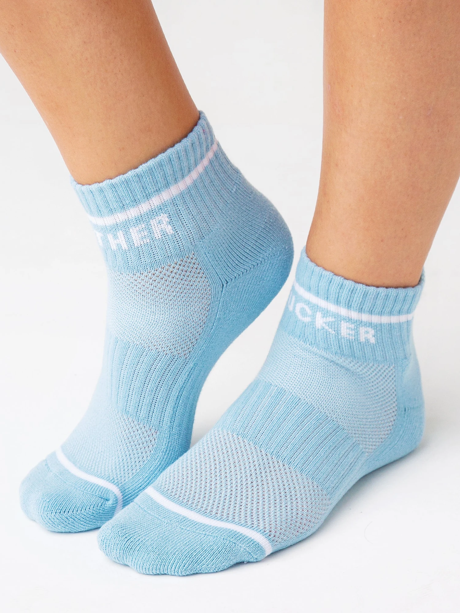FEATURES:SocksAnkle LengthRibbed TextureText Along Front85% Cotton, 13% Polyester, 2% SpandexMade in South Korea