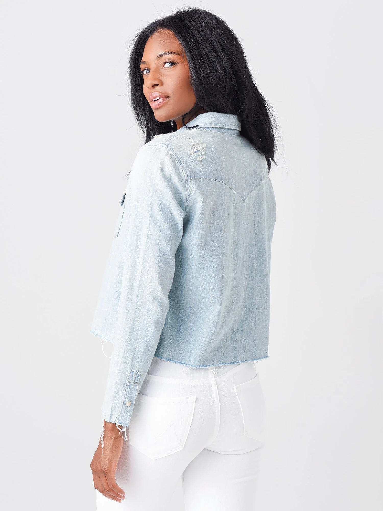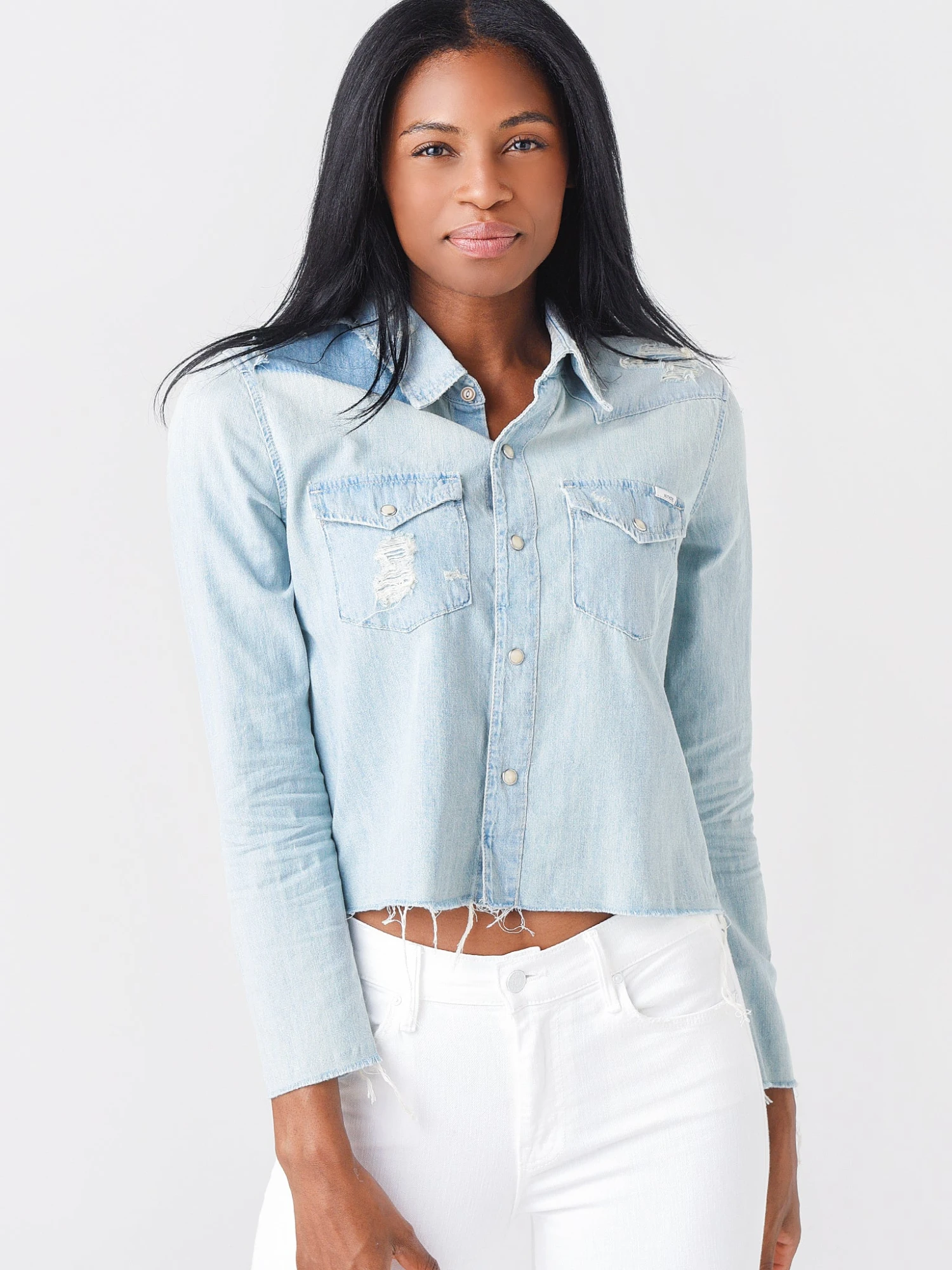 FEATURES:Button-Down TopStandard CollarChest Pockets w/ ButtonsButton-Down PlacketFrayed Hem and CuffsDistressed DetailsCropped SilhouetteSoft, Lightweight Denim100% CottonModel is wearing size Small top.Model’s Measurements: Height: 5’10” | Bust: 34B | Waist: 25.5″ | Hips: 36.5″ | Dress: 2-4 (US)