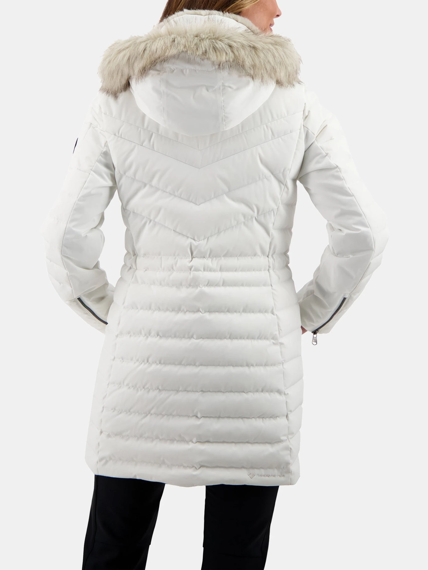 FEATURES:Allied Feather & Down 800 Fill Power Goose Down Body, Sleeve, & Hood; Thermore® Classic 80gm Under Sleeve2-way adjustable and removable hoodRemovable faux fur, Faux fur inner collar, Faux fur interior panelsAdjustable waistYKK® Delta® zippers2-way, front zipperDouble-entry hand pockets, Napoleon pocket, Zipper sleeve pocketZipper cuffsRib knit inner cuffShaped hemInterior windguard, Fleece chin warmerAdjustable, water-resistant powderskirtKey keeperMetallic piping detailAvailable in special sizing