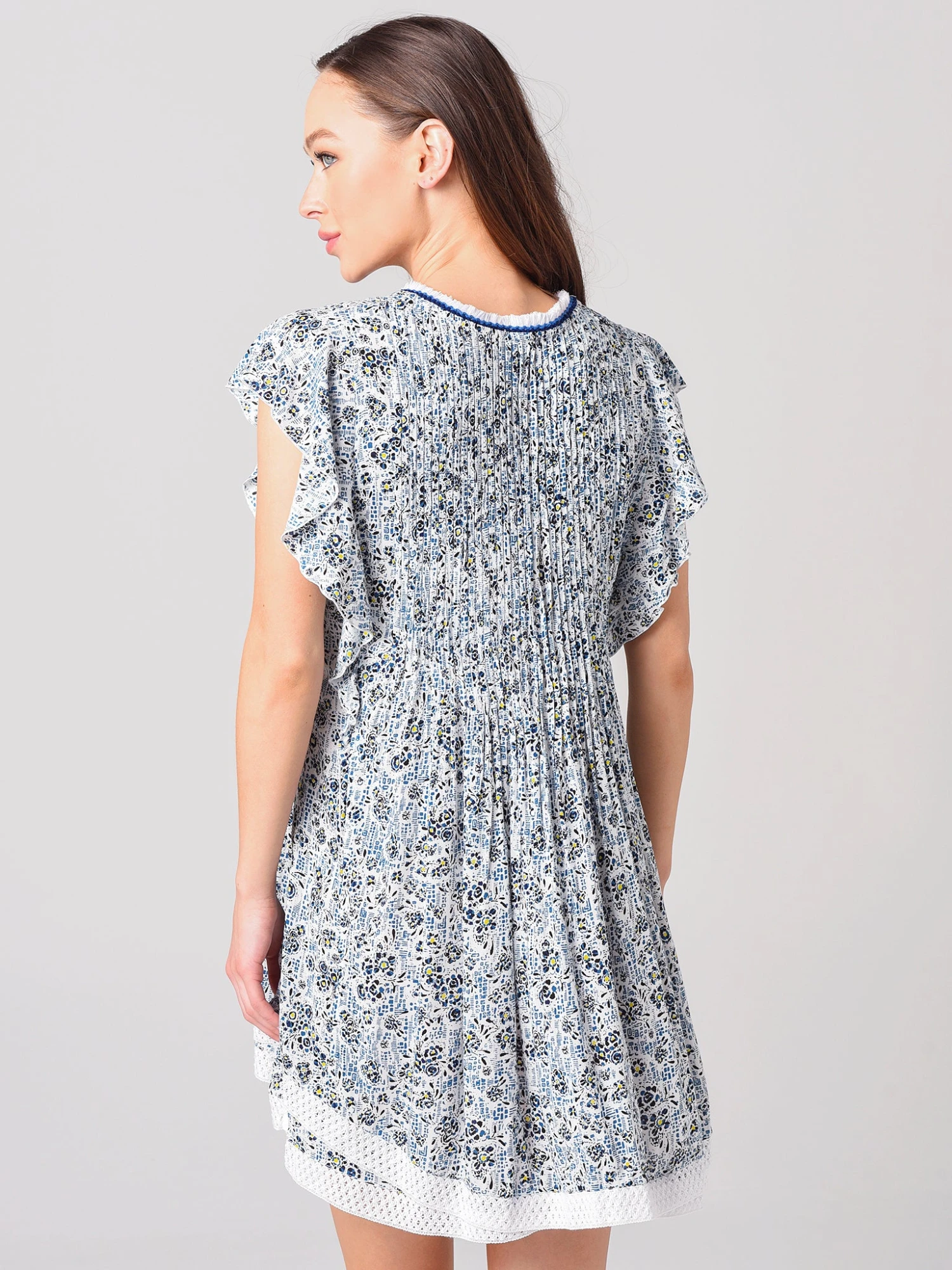 FEATURES:Mini DressV-Neckline with Decorative TrimFlutter SleeveDelicate Pleats on FrontTassel DetailsDecorative Crochet Trim on HemAll-Over MotifCan Double as Cover Up