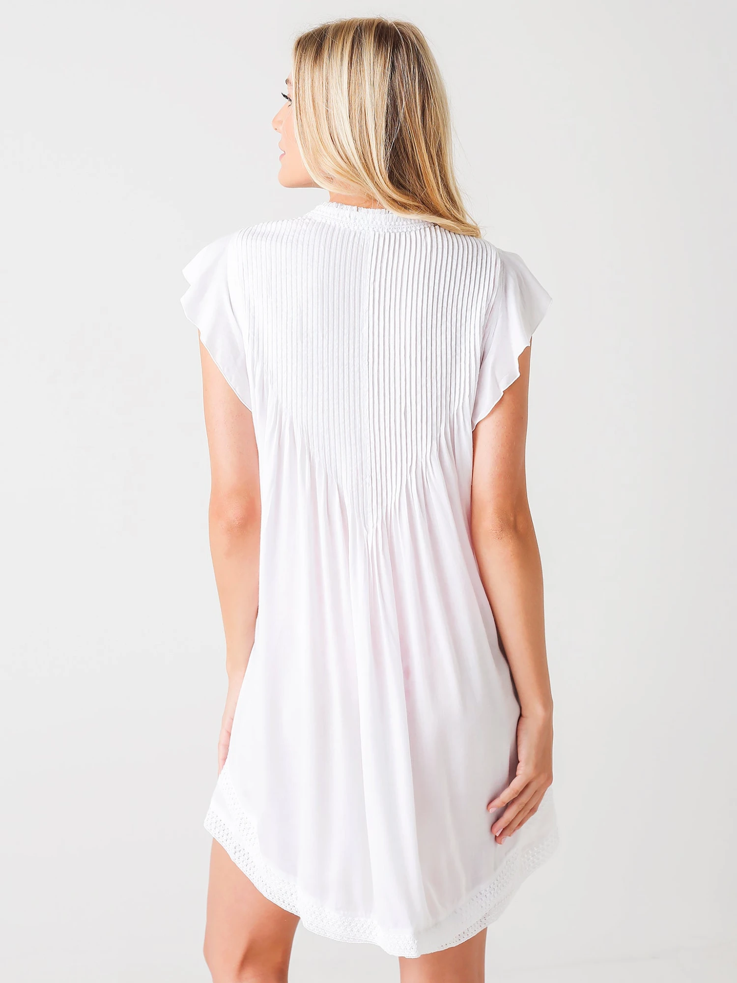 FEATURES:Mini DressSplit, V-Neckline with Frayed EdgeFlutter Butterfly SleevePleated BodiceTiered Skirt StylingInset Lace TrimLightweight and AiryClassic Fit100% ViscoseModel is wearing size Small dress.Model’s Measurements: Height: 5’9″; Bust: 34B; Waist: 26″; Hips: 37″; Dress Size: 2-4 (US)