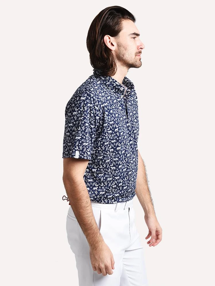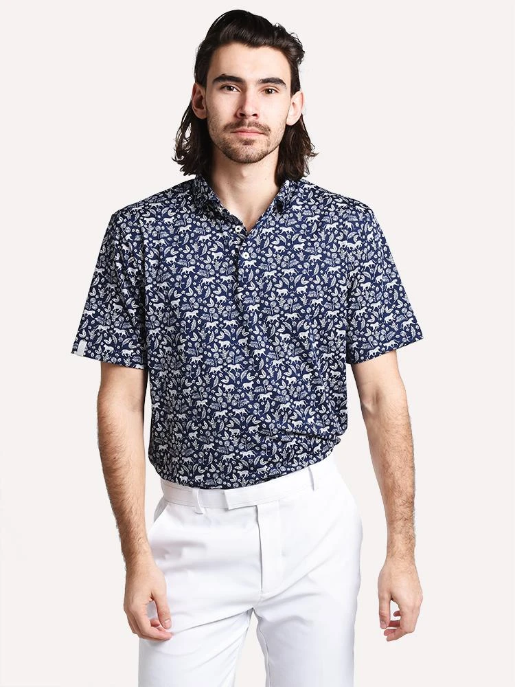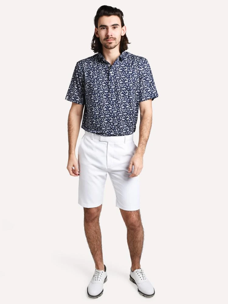 FEATURES:Golf Polo ShirtShort Sleeve3-Button PlacketSelf CollarAll-Over Jungle PrintCustom Slim Active FitWoven RLX Loop at Right CuffAirflow Performance93% polyester, 7% ElstaneStyled with G/Fore Short Style # G4MC0B01. Model is wearing size Medium shirt and size 32 short.