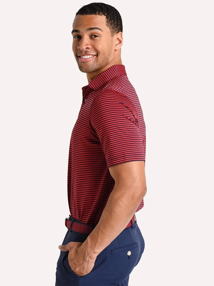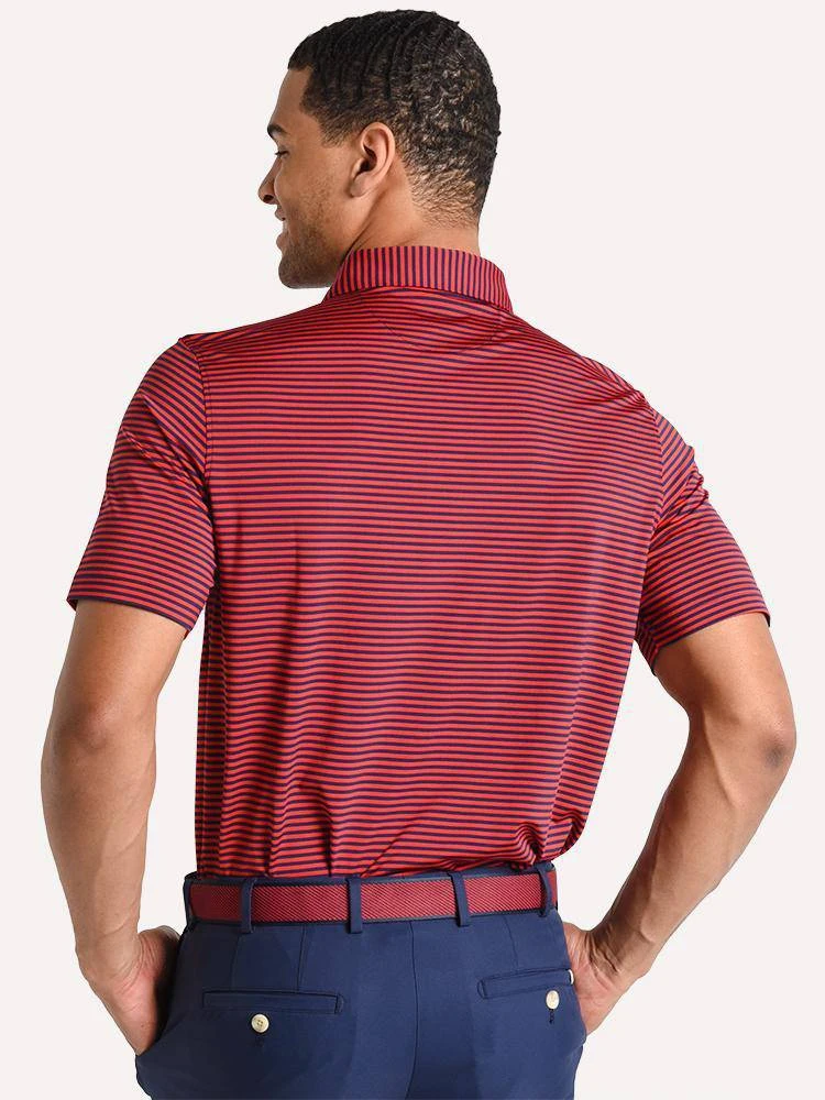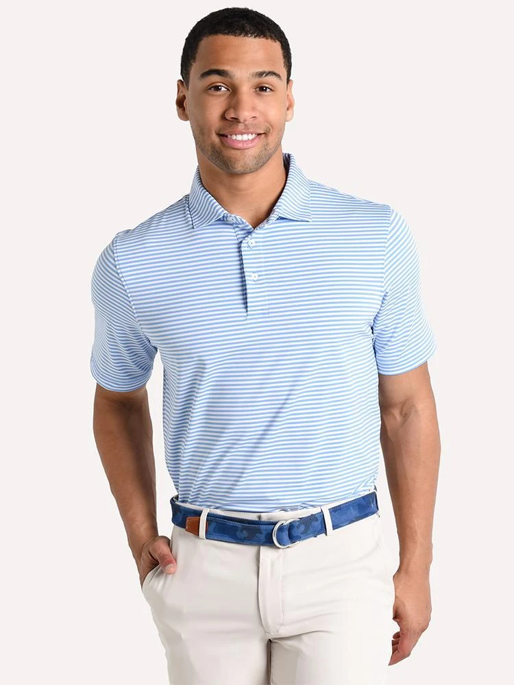 FEATURES:Sean collar Three button placketShort sleeve Saint Bernard logo tab on right sleeve Moisture-wicking and quick-drying Performance fit 87% polyester, 13% spandex Machine wash Styled with Peter Millar Short Style # ME0EB82 and belt Style # MS19EA15. Model is wearing size medium polo and size 32 short.