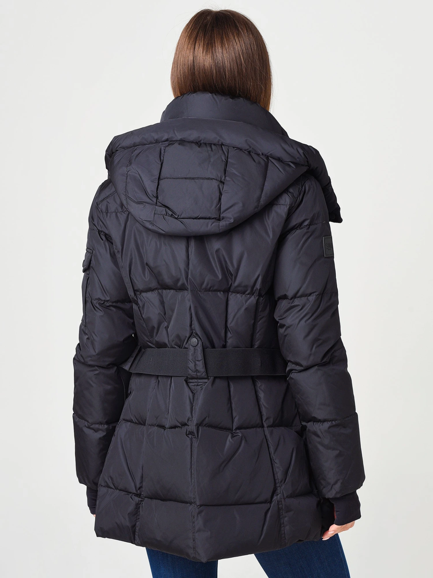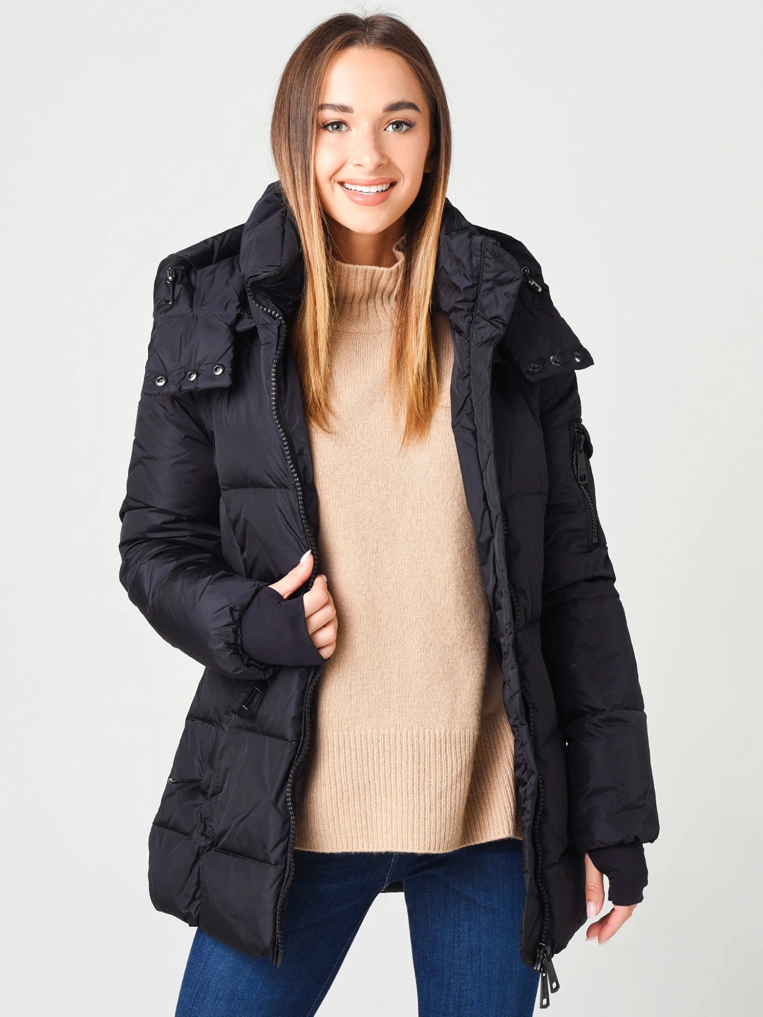 FEATURES:Down CoatDetachable Zip-Off HoodCenter Zip ClosureStretch Cuffs with ThumbholesDetachable Belt with SAM Logo Embossed Metal Buckle2 Lower Zip Pockets, Sleeve Zipper PocketSnap Button DetailsMid-LengthWind-Resistant, Water-RepellentLightweightMatte FinishShell: 100% Nylon; Lining: 100% Nylon; Fill: 80% Goose Down, 20% FeatherModel is wearing size Small coatModel’s Measurements: Height: 5’9″; Bust: 32C; Waist: 24.5″; Hips: 36″; Dress Size: 2 (US)