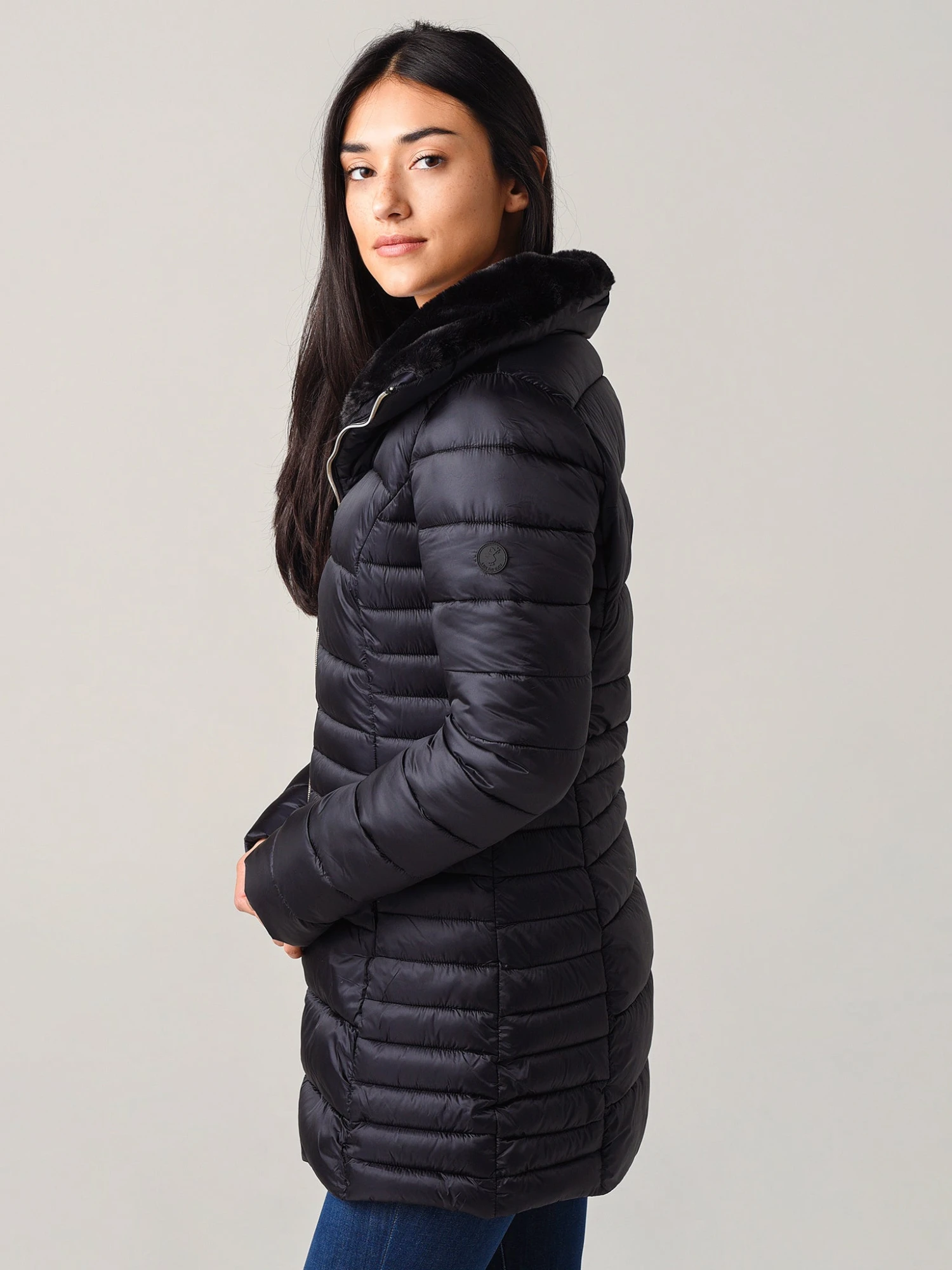 FEATURES:Winter CoatHigh, Stand-Up Collar2-Way Full Frotn Zipper ClosureLong SleeveQuilted Design, Internal Elastic StitchingHidden Zipper Hand Warmer PocketsFaux-Fur Lined CollarWindproof and Water-ResistantSilky Shiny FinishOeko-Tex® Certified, 100% Animal FreeFace: 100% Nylon (High-Density 20D x 20D); Fill: 100% PolyesterModel is wearing size Small jacket.Model’s Measurements: Height: 5’8″; Bust: 32B; Waist: 25″; Hips: 36″; Dress Size: 2 (US)