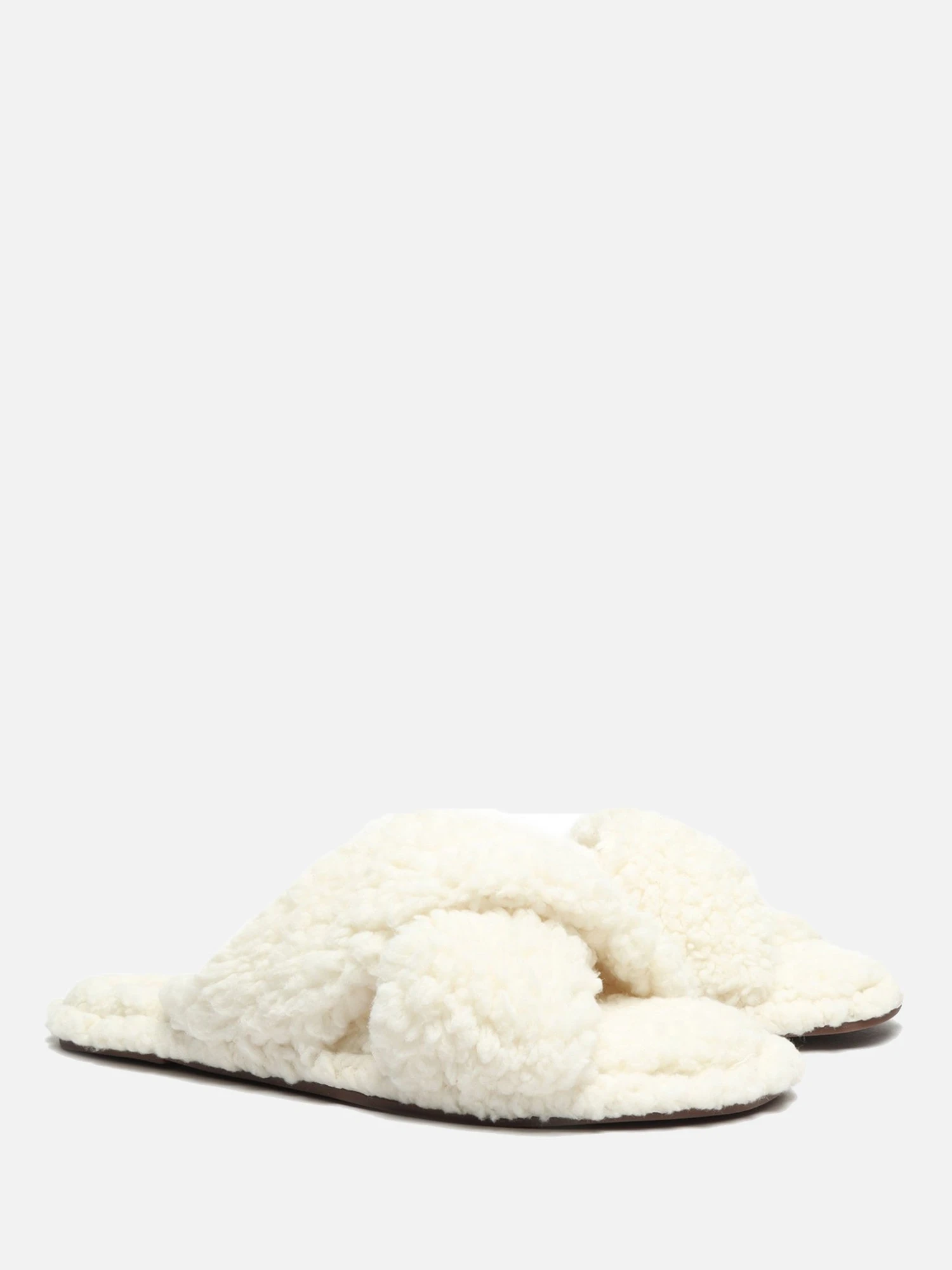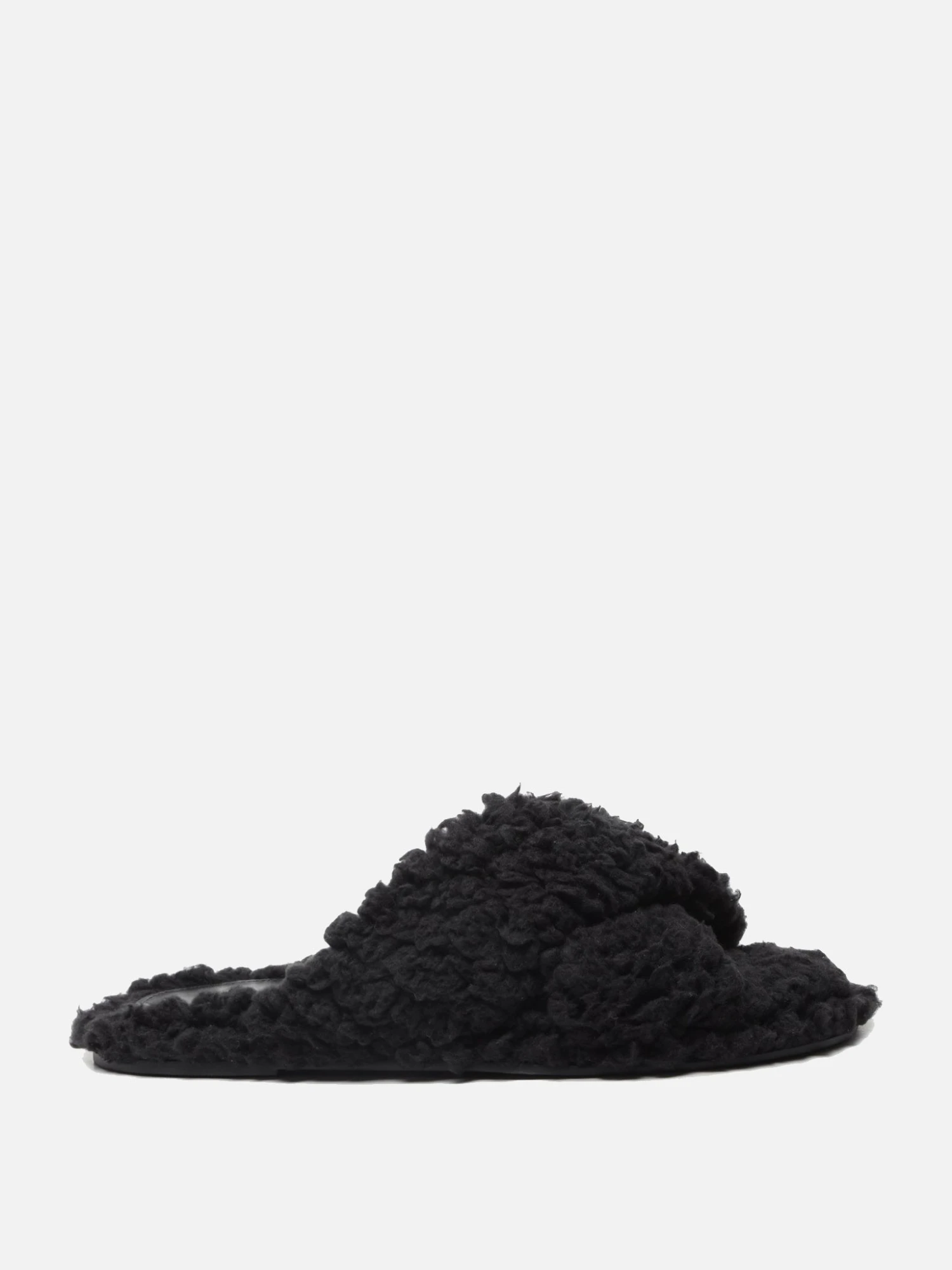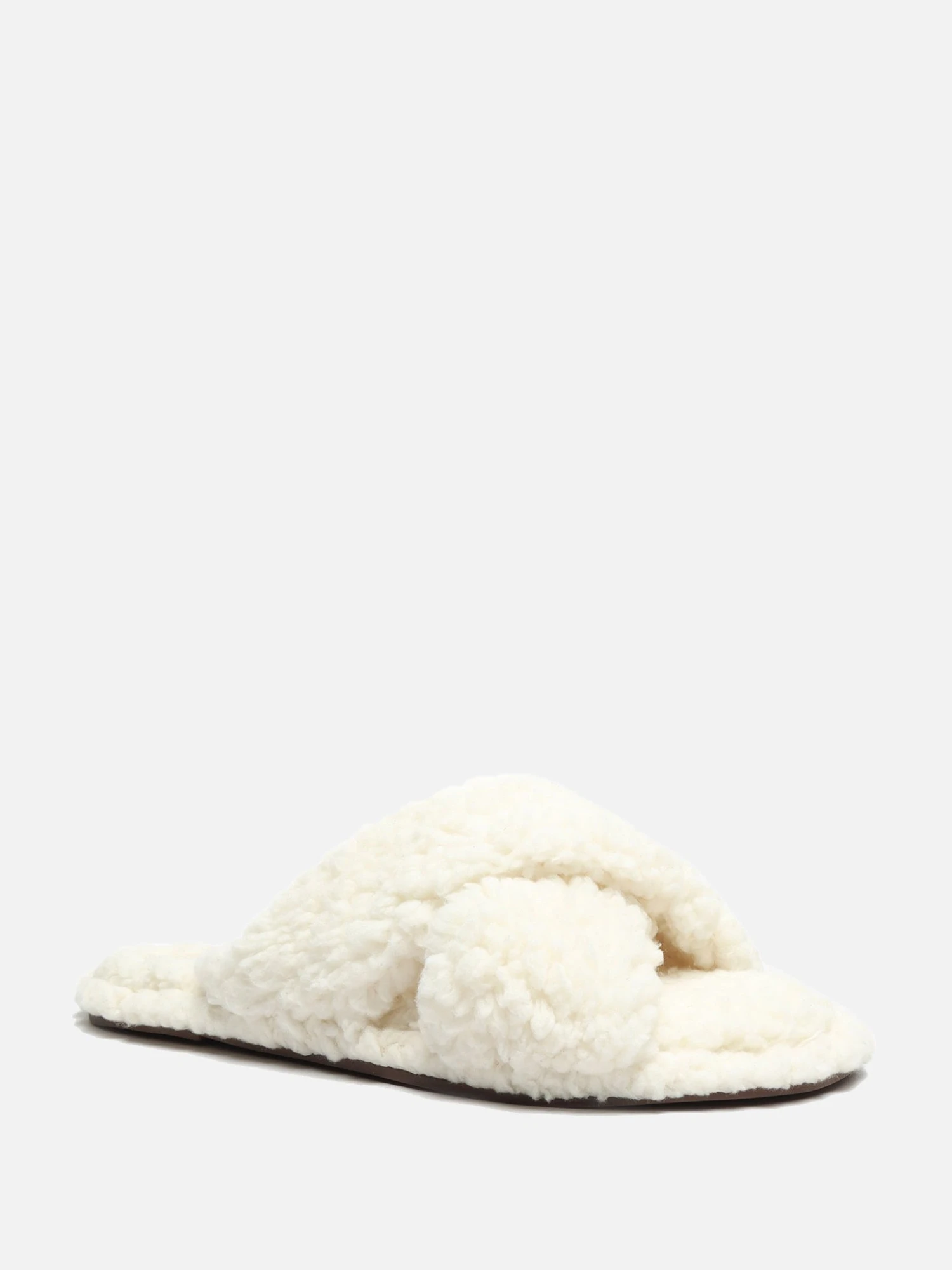 FEATURES:SlipperEasy On/OffCriss Cross StrapFluffy Faux ShearlingHeel Height: 0.4 in.