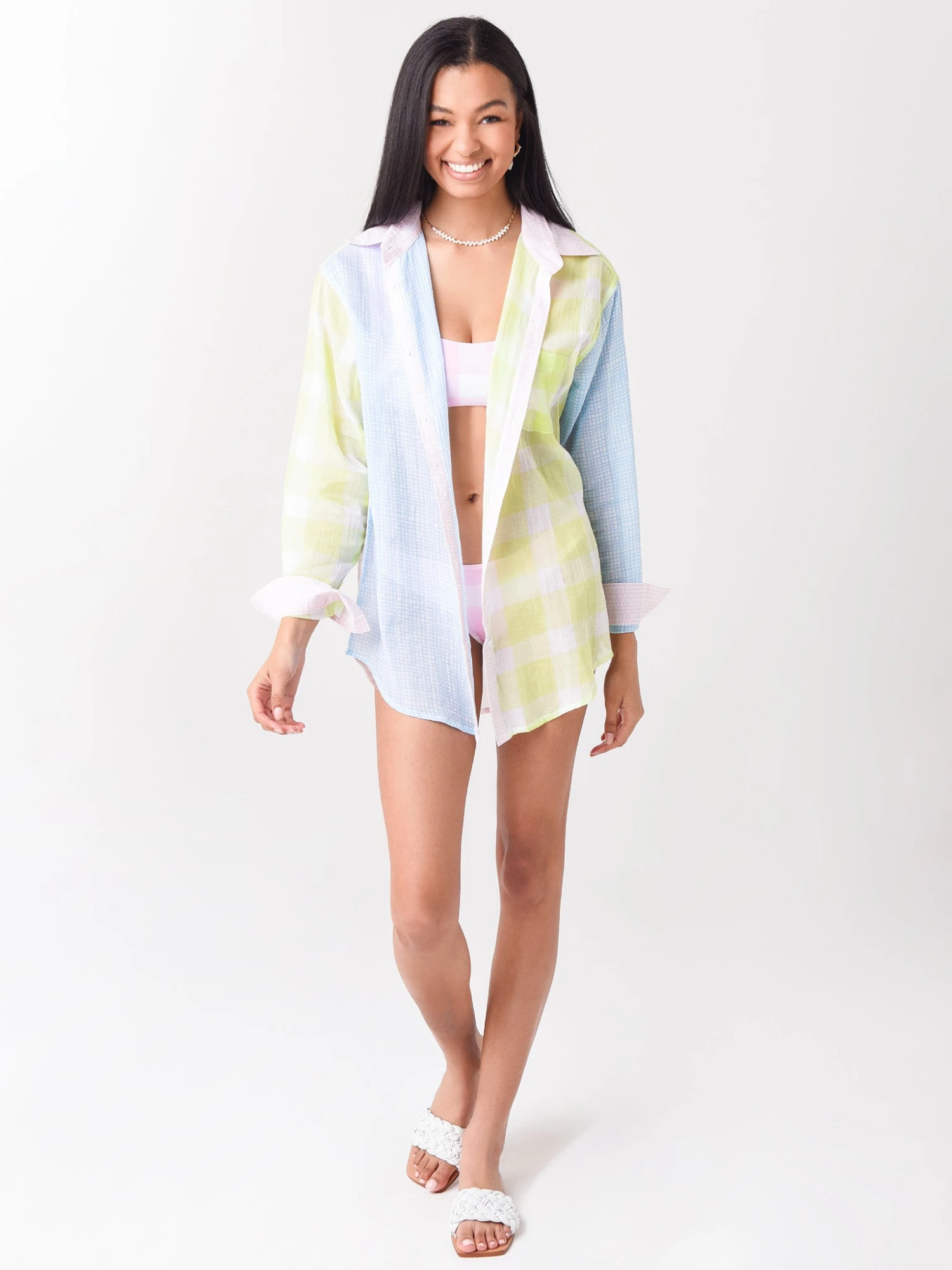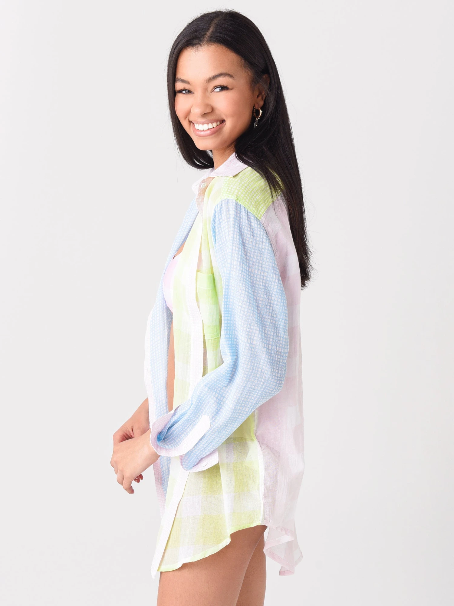 FEATURES:Cover-UpShirt StyleOversized SilhouetteShirt CollarButotn-Down DetailMutli-Media Color-Blocked DetailButton CuffsVersatile StylingLightweight100% CottonModel is wearing size Small cover-up.Model’s Measurements: Height: 5’10”; Bust: 32C; Waist: 25″; Hips: 35″; Dress Size: 0 (US)