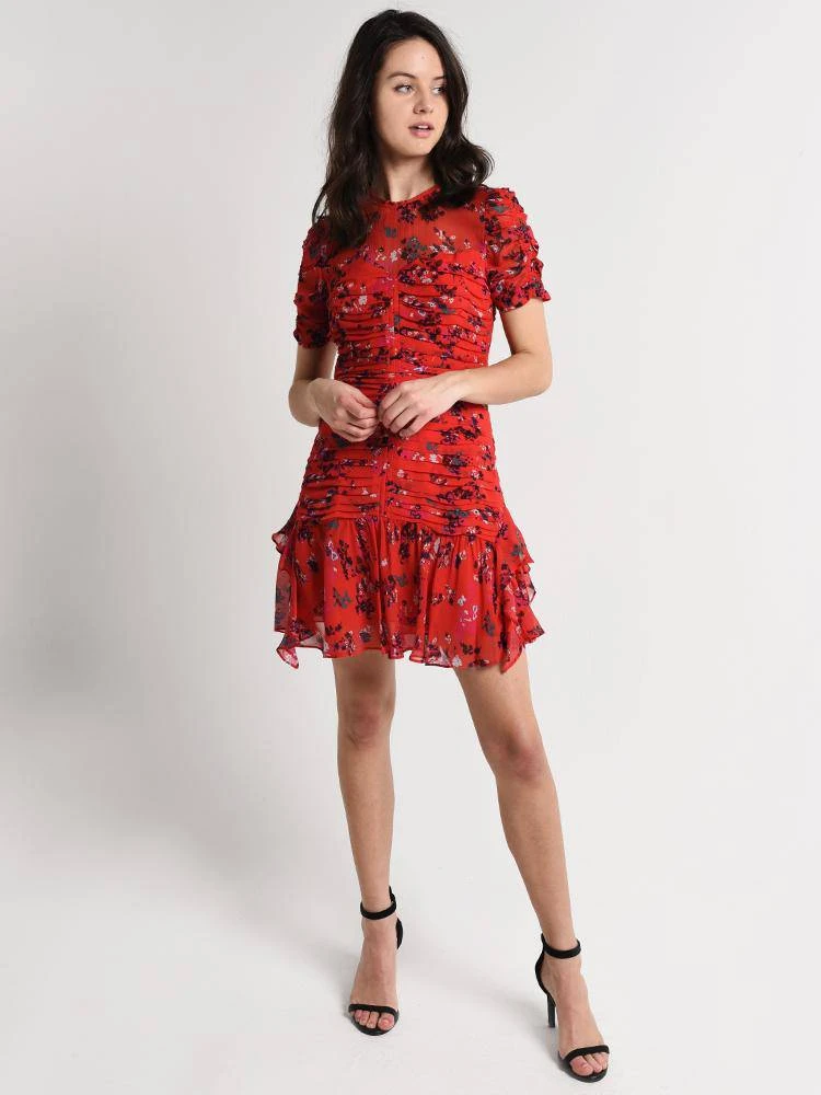 The Tanya Taylor Carti Dress is an ultra femnine mini-dress with ruching throughout the waist and sleeves, this dress is perfect for when you’re feeling flirty.