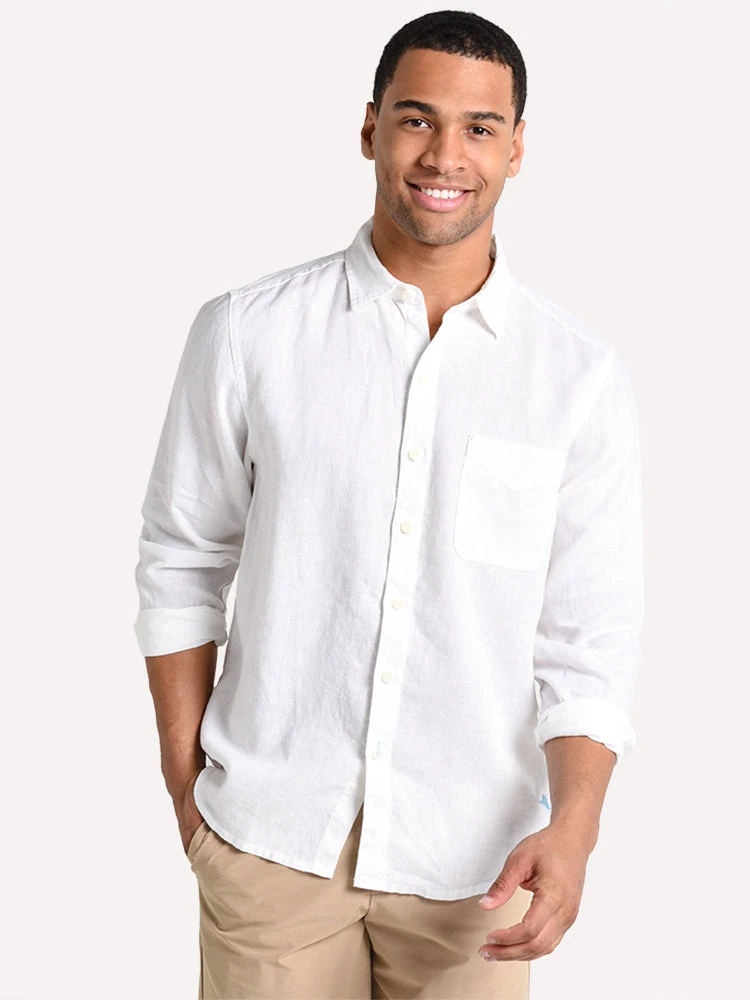 FEATURES:Lightweight linen breathes for that tropical resort vibe.Embroidered Sailfish at side seam.Long sleeve, button-up shirt.Patch chest pocket.Single-button cuffs.Shirttail hemline.Straight back yoke with side pleats.100% linen.Machine wash cold, tumble dry low.Imported.Styled with Tommy Bahama short Style # T818027 and Olukaisandals Style # 10390-1363. Model is wearing size Medium shirt and size 32 short.