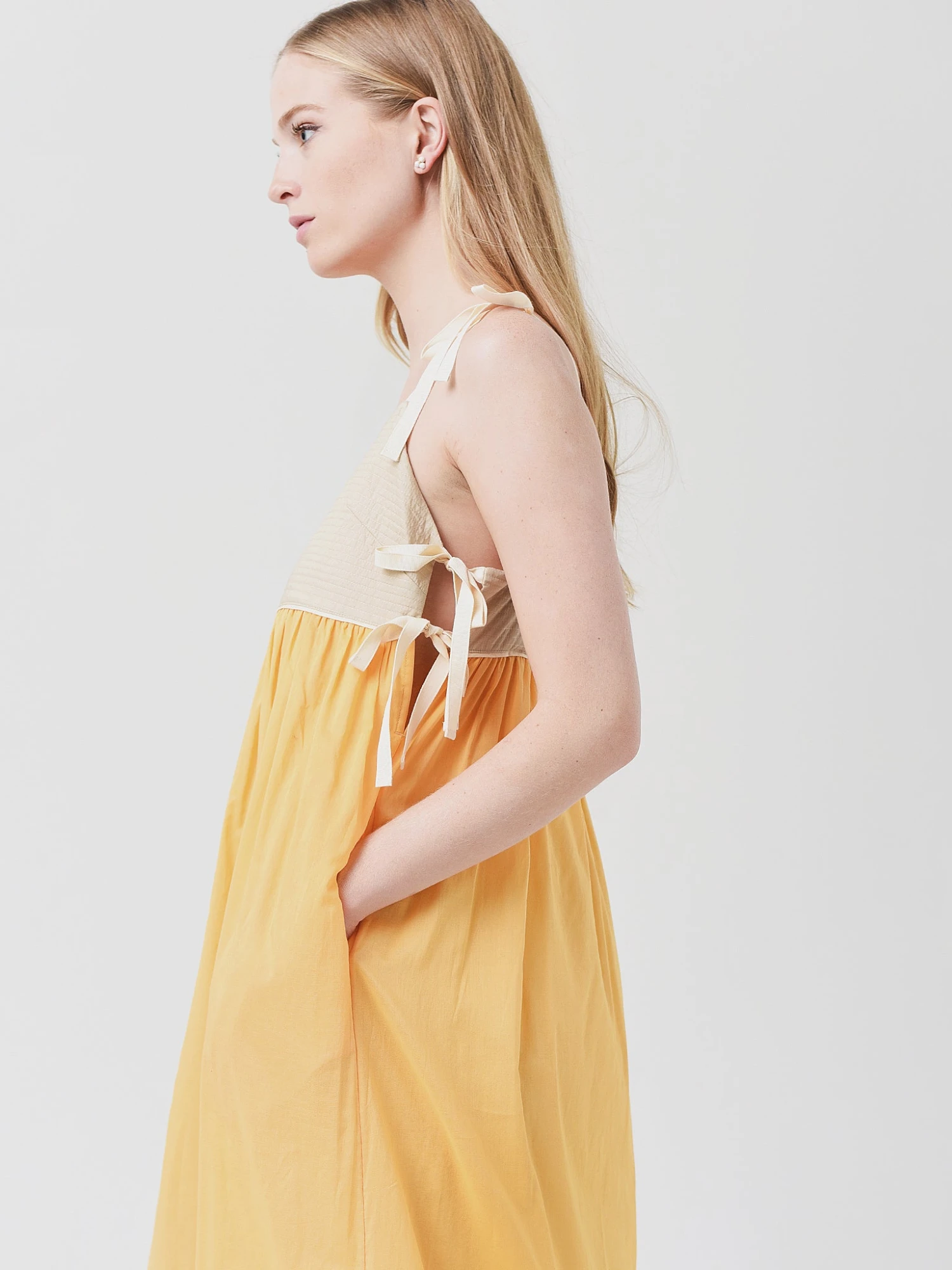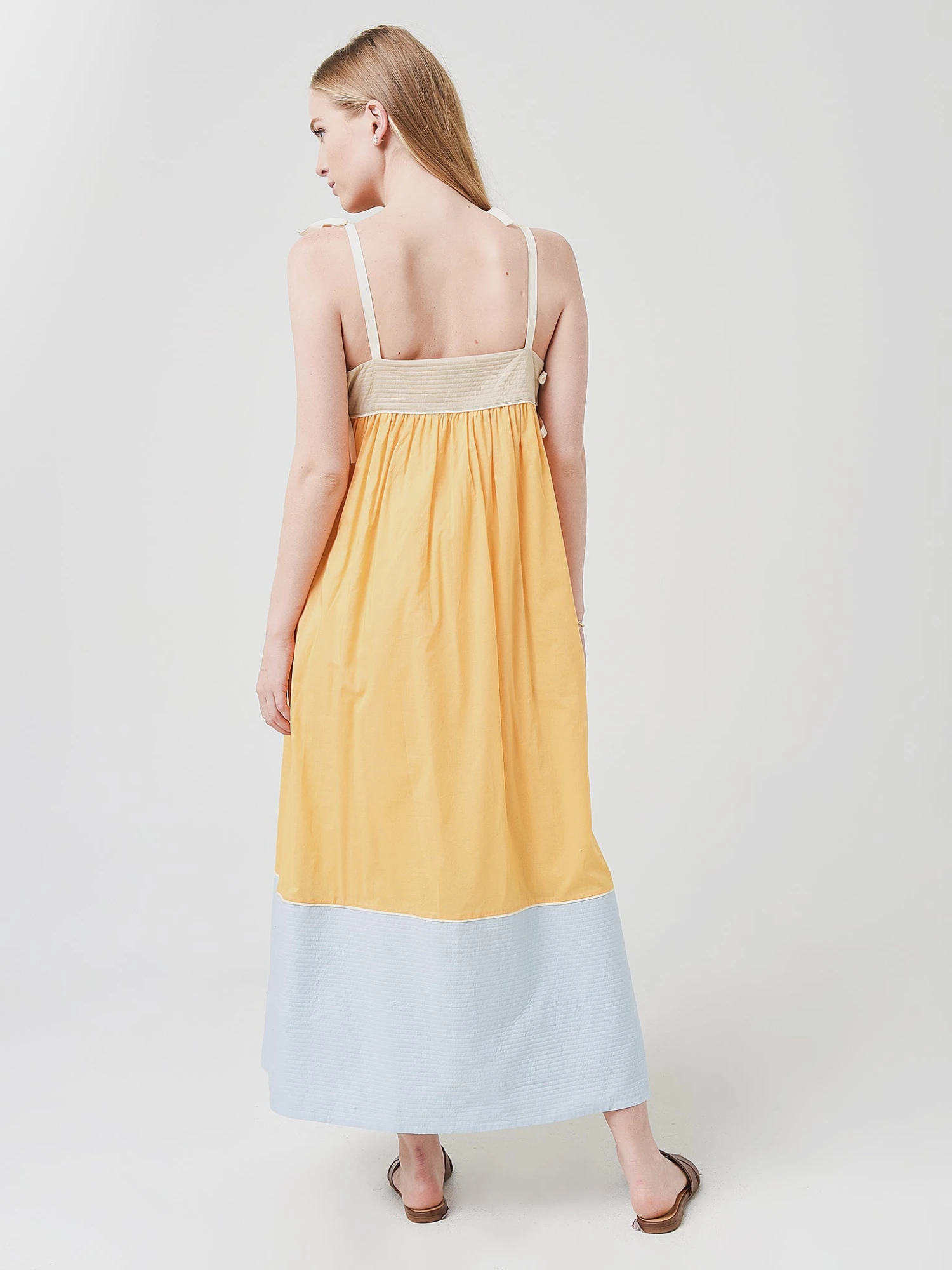 FEATURES:Dress/Swim Cover UpSquare NecklineAdjustable Spaghetti-StrapsSplit Sides with Adjustable StringsEmpire WaistColorblocked PanelsA-Line SilhouetteRelaxed FitStraight Hem100% CottonModel is wearing size Small dress.Model’s Measurements: Height: 5’9.5″ | Bust: 32C | Waist: 26″ | Hips: 35.5″ | Dress: 2 (US)