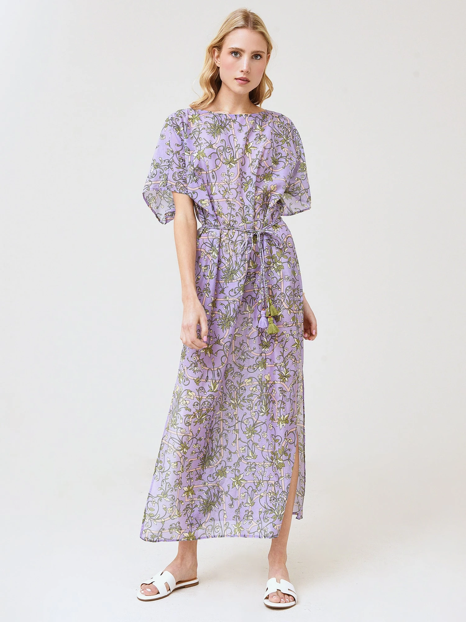 FEATURES:Caftan/Cover-UpRound NecklineShort SleeveRemovable Self-Tie Waist BeltSide SlitsAll-Over Novelty PrintLength: 56.5 in.Lightweight Fabrication70% Cotton, 30% SilkRelaxed FitModel is wearing size Small caftan.Model’s Measurements: Height: 5’10.5″ | Bust: 32B | Waist: 24.5″ | Hips: 36″ | Dress Size: 2 (US)