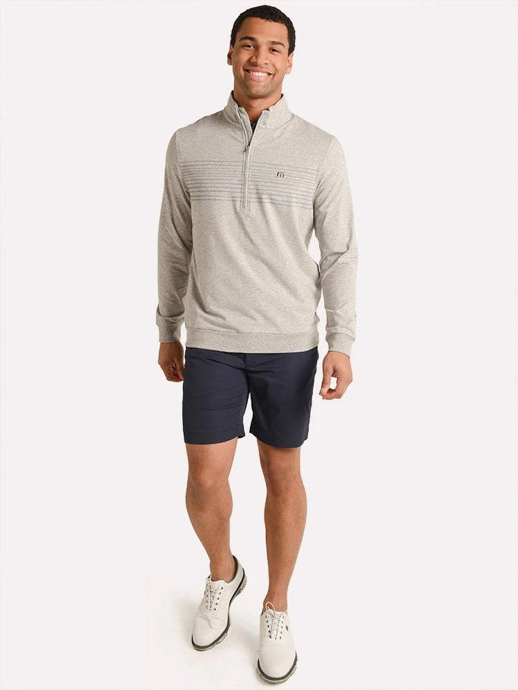 FEATURES:Half-Zip PulloverStructured CollarHidden Stash Side PocketsDistressed Print with Contrast Stripes Across ChestWrinkle Resistant StretchEmbroidered Logo on Left Chest and Upper-Center Back58% Cotton, 32% Polyester, 10% ElastaneStyled with Travis Mathew polo Style # 1MQ013 and Ralph Lauren shorts style # 785731614. Model is wearing size Medium pullover, Medium polo and size 32 shorts.