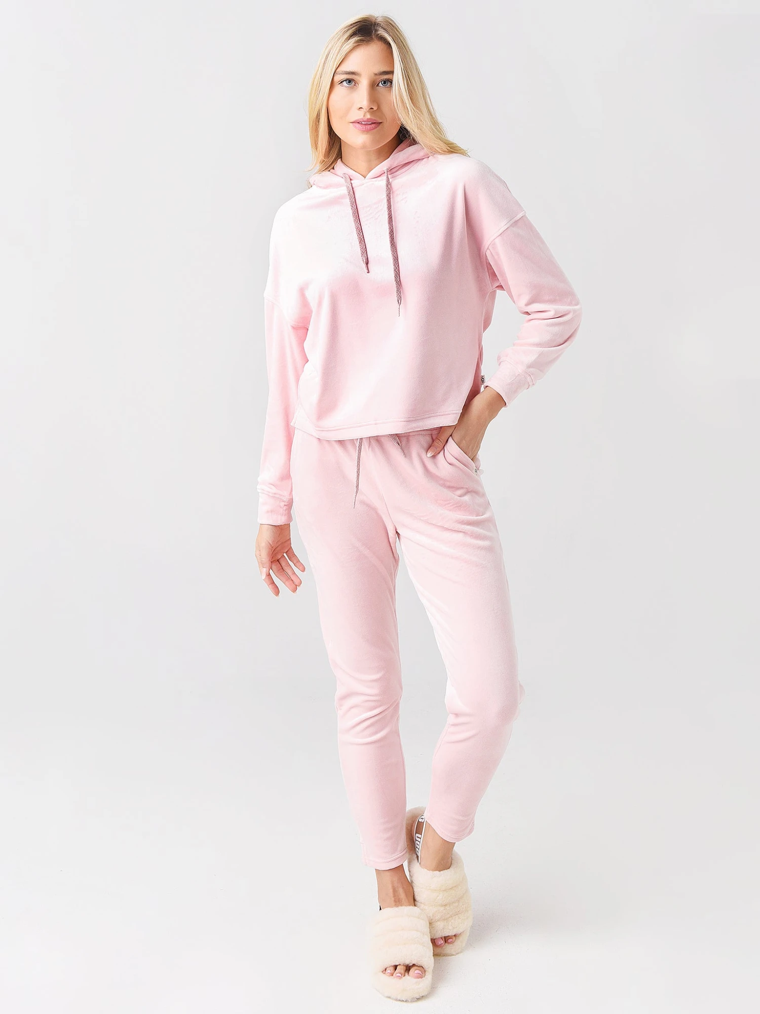 FEATURES:JoggerElastic Waistband with DrawstringSide PocketsTapered LegInseam: 28.5 inVelvet Fleece Fabrication95% Polyester, 5% ElastaneClassic FitModel is wearing size Small jogger.Model’s Measurements: Height: 5’9″ | Bust: 34B | Waist: 26″ | Hips: 37″ | Dress Size: 2-4 (US)