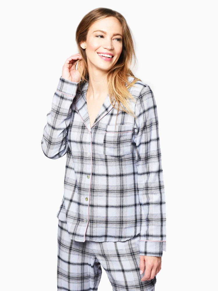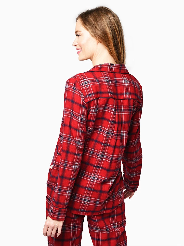 FEATURES:Windowpane Plaid PatternNotch CollarButton FrontLong SleeveSatin Piping ThroughoutChest PocketMatching Lounge Pants with Satin Drawcord and Elastic WaistbandGift Ready – Folded with a Holiday Branded Belly BandStyled With UGG Slippers Style #1102594