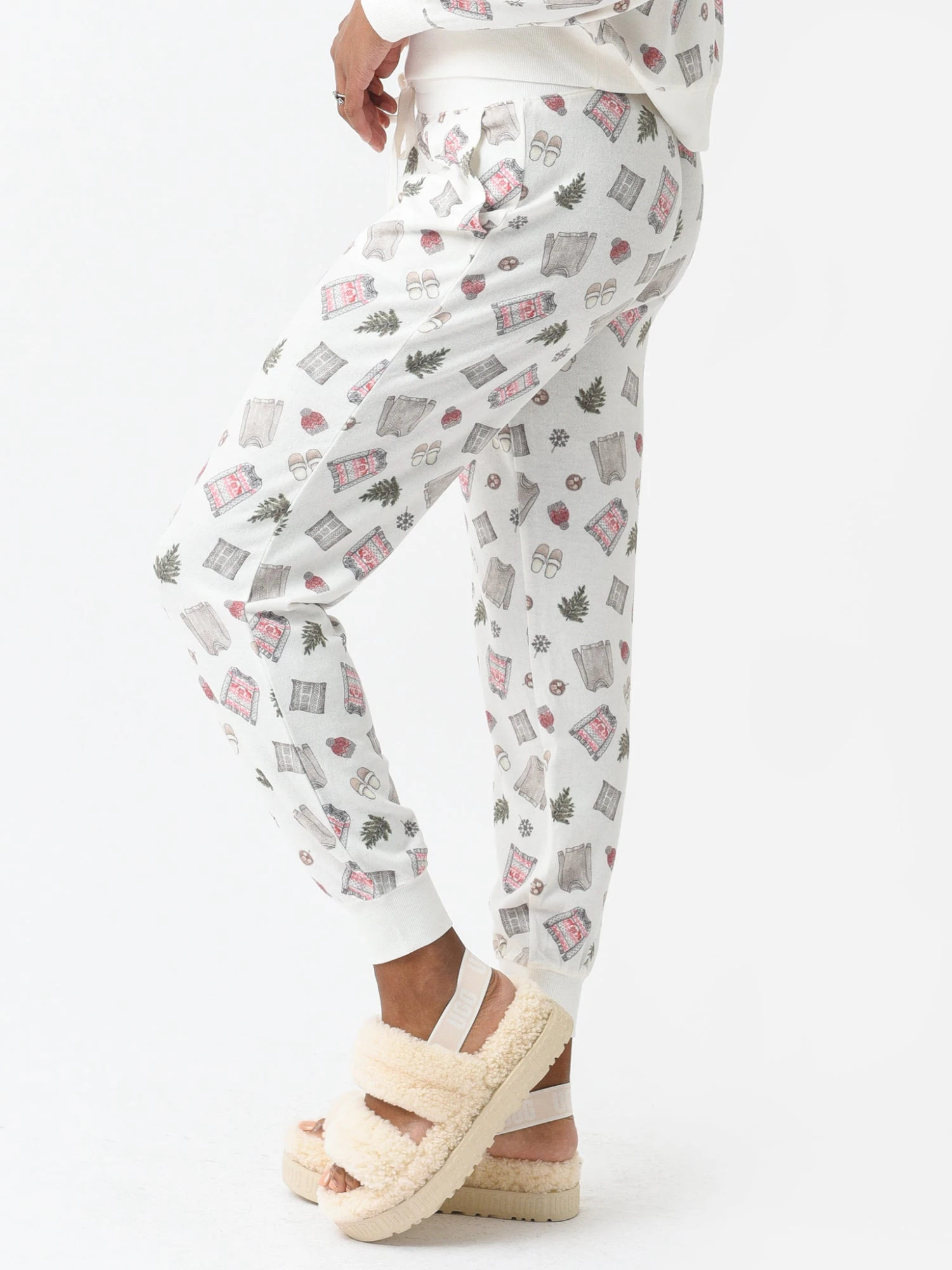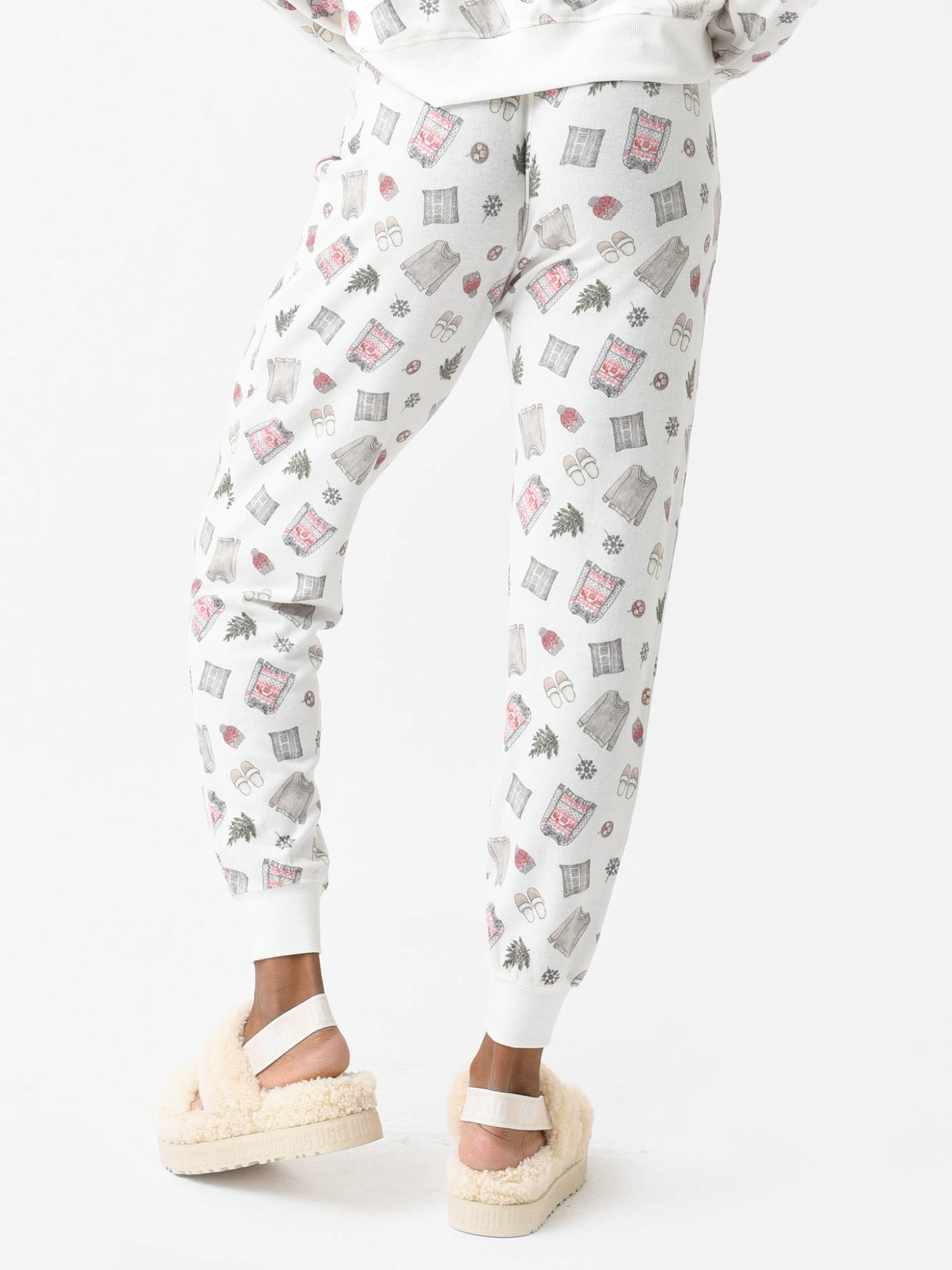 FEATURES:JoggerElastic Waistband with DrawstringSide PocketsTapered LegAll-Over Novelty PrintBrushed Knit FabricationBanded Ankle Cuffs62% Polyester, 33% Rayon, 5% SpandexClassic FitModel is wearing size Small jogger.Model’s Measurements: Height: 5’10” | Bust: 34B | Waist: 25.5″ | Hips: 36.5″ | Dress Size: 2 (US)